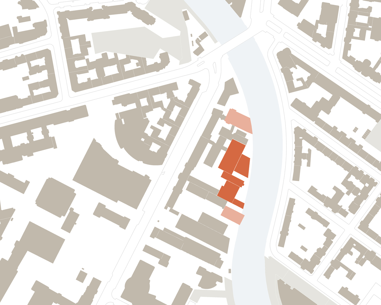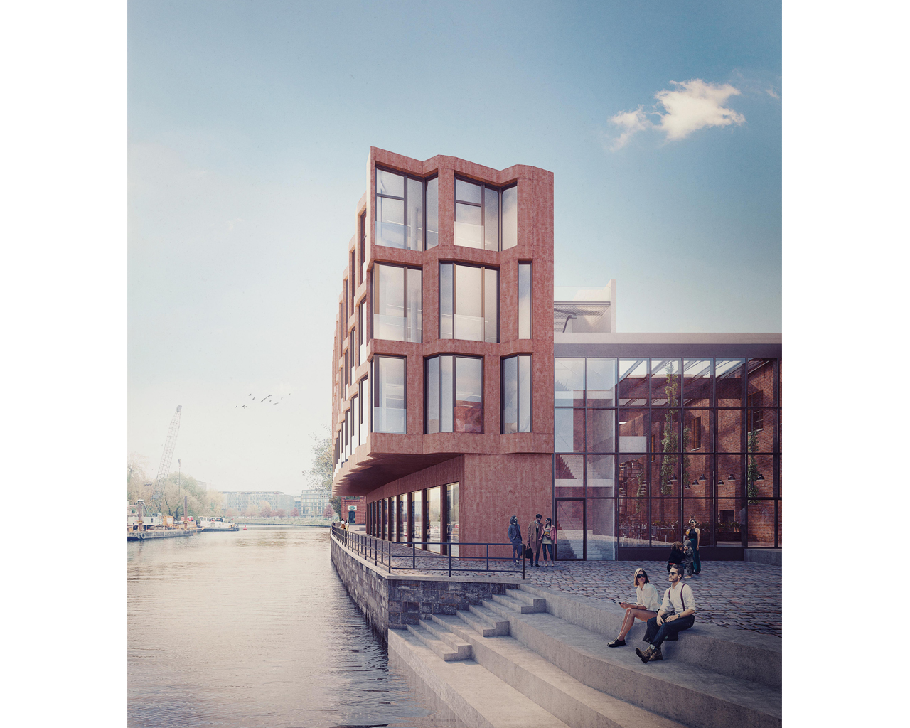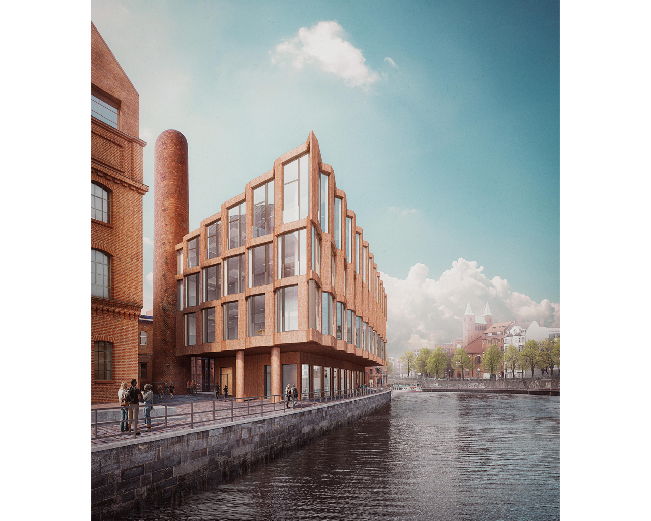 Das historische Ensemble der Gebauer Höfe mit seiner typischen Gewerbearchitektur des ausgehenden 19. Jahrhunderts prägt die Uferkante. Die bisher bereits sanierten Gebäude des denkmalgeschützten Ensembles beherbergen eine Kombination aus Büros, Ateliers, Einzelhandel und Gastronomie und werden nun um ein weiteres Highlight erweitert.