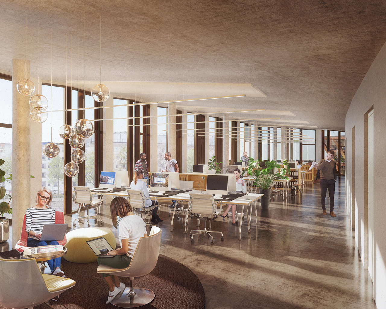 Der Neubau ist in einen halböffentlichen Hallenteil, der an das Bestandsgebäude 50 anschließt und in einen ab dem ersten Obergeschoss Richtung Spree auskragenden Baukörper gegliedert. Im Gebäudekern finden sich Treppenhaus, Aufzug und Sanitäranlagen. Die verglaste Halle hat die Höhe von zwei Geschossen und verfügt über eine Galerie. Der Neubaukörper erhält ein zur Halle abfallendes Pultdach und nimmt damit den Rhythmus der Schrägdächer des Bestands auf. Seine großzügigen Büroflächen orientieren sich Richtung Spree und verfügen über eine natürliche Belichtung und Belüftung. Das Erdgeschoss ist mit Abstand zur Uferlinie und als Aufenthaltsbereich mit Außenterrasse geplant. An ihr vorbei führt eine neu angelegte Uferpromenade.