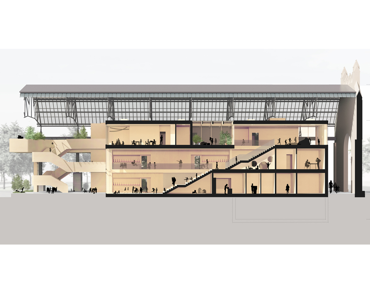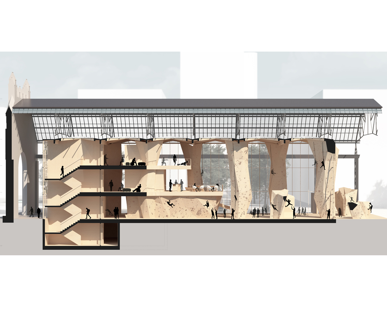 Wir waren gebeten, das Potential der Halle mit verschiedenen Nutzungsideen durchzuspielen. So entwickelten wir Konzepte für ein dreigeschossiges Co.Production Laboratory, für eine Kindertagesstätte und auch für eine Boulder- und Kletterhalle.
