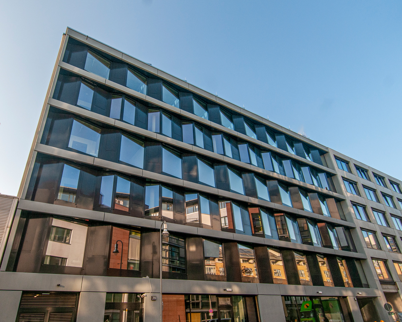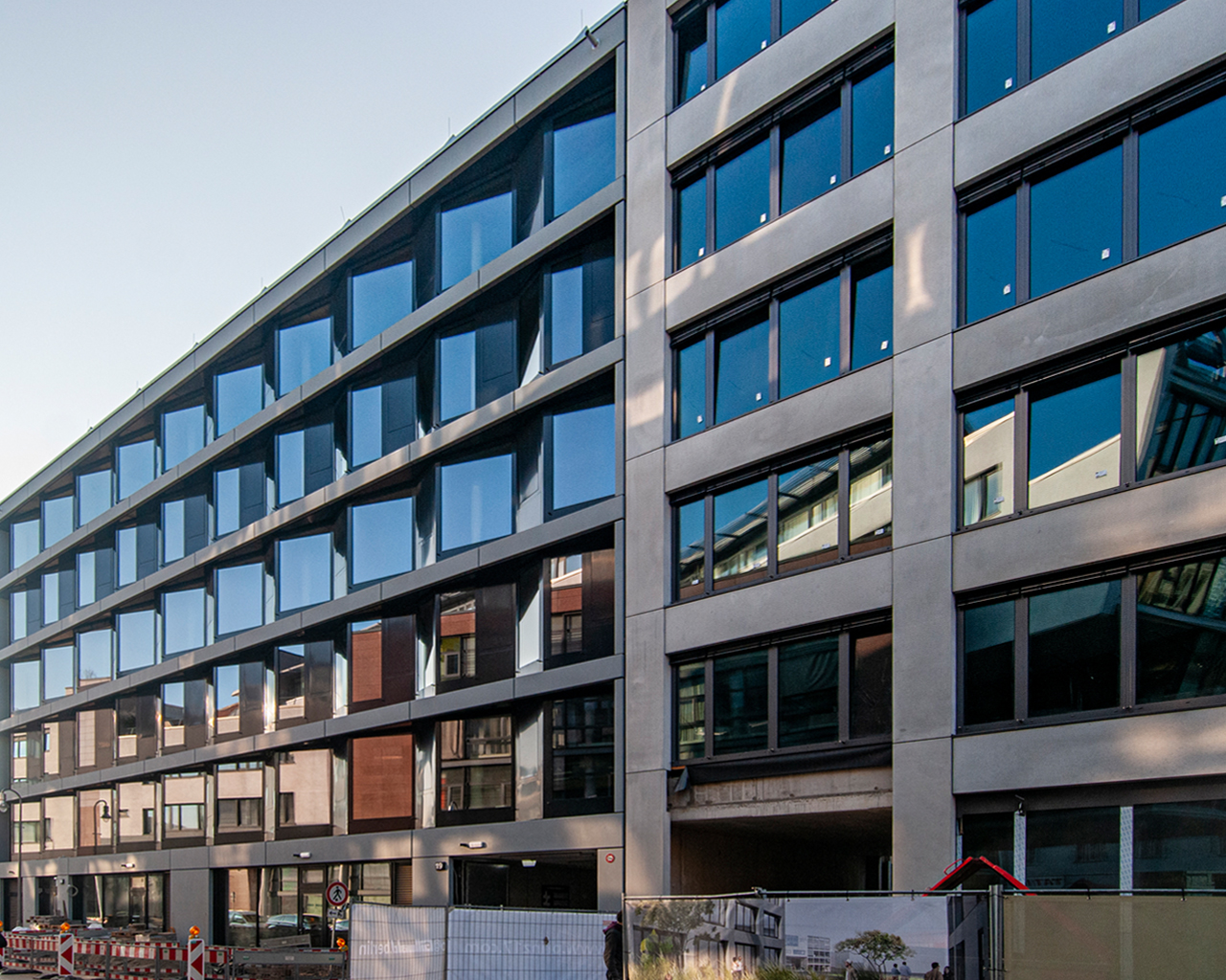 Der Neubau ist unterteilt in seinen monolithischen Sockel im Erdgeschoss und die sich darüber entfaltende Glasfassade der Obergeschosse. Sie besteht aus versetzt angeordneten Glasrahmenkonstruktionen in Kombination mit Betonfertigteilelementen in den Geschossdeckenebenen. Die in Faltung angeordneten Fassadenelemente sind zum einen als vertikale Referenz zu den industriell geprägten Scheddächern auf Teilen des Gebäudeensembles zu verstehen und bieten zum anderen einen mehrseitigen Ausblick sowohl zur Oranienstraße und dem nahe gelegenen Moritzplatz als auch Richtung Kottbusser Tor. Ablesbar ist die Unterteilung der Obergeschosse in unterschiedliche Bereiche: Die Regelgeschosse sind als flexible Großraumeinheiten zur Büronutzung angelegt, das Dachgeschoss aufgrund der größeren Raumhöhe und der zusätzlichen Belichtung über das Sheddach auch als Atelier nutzbar.
