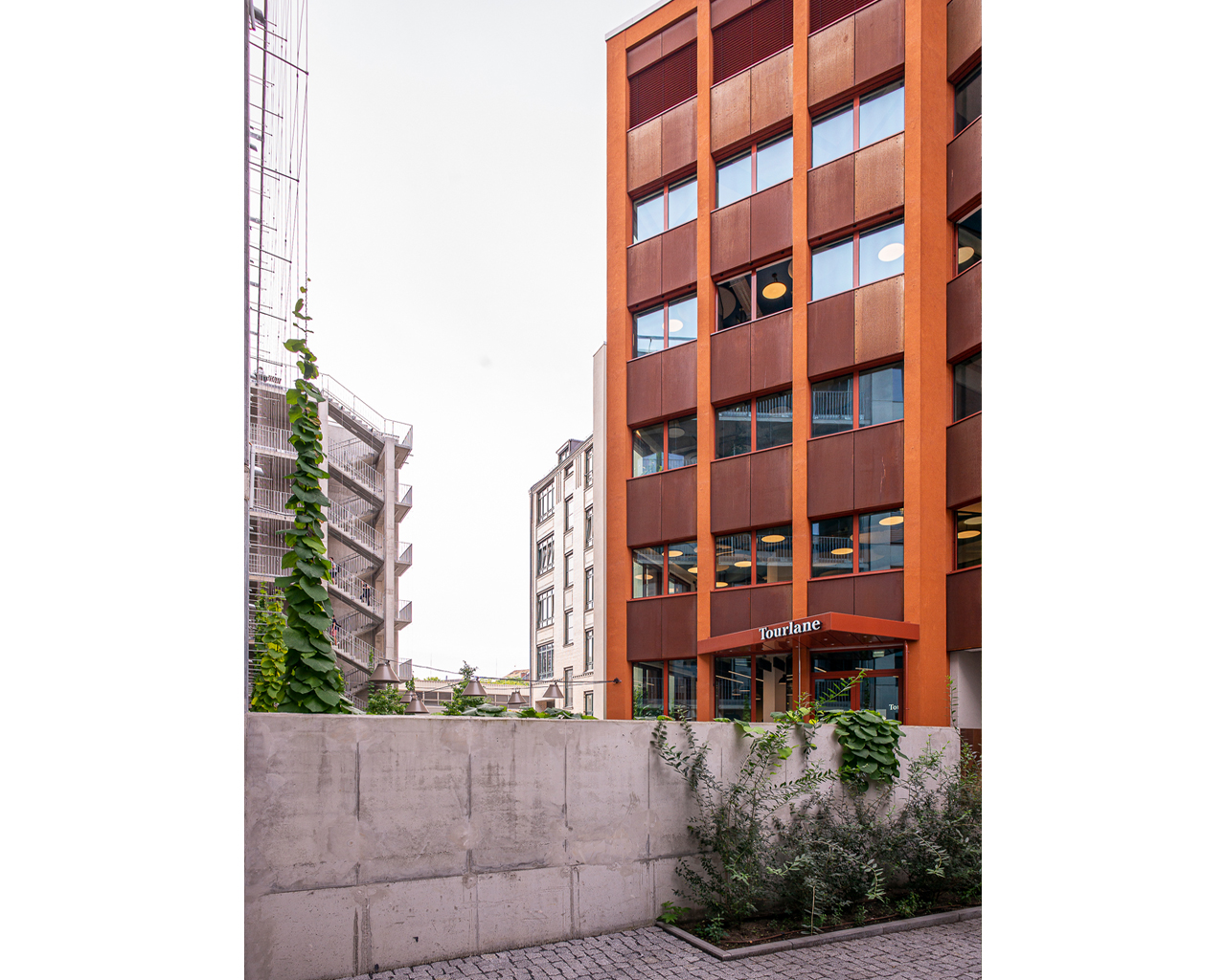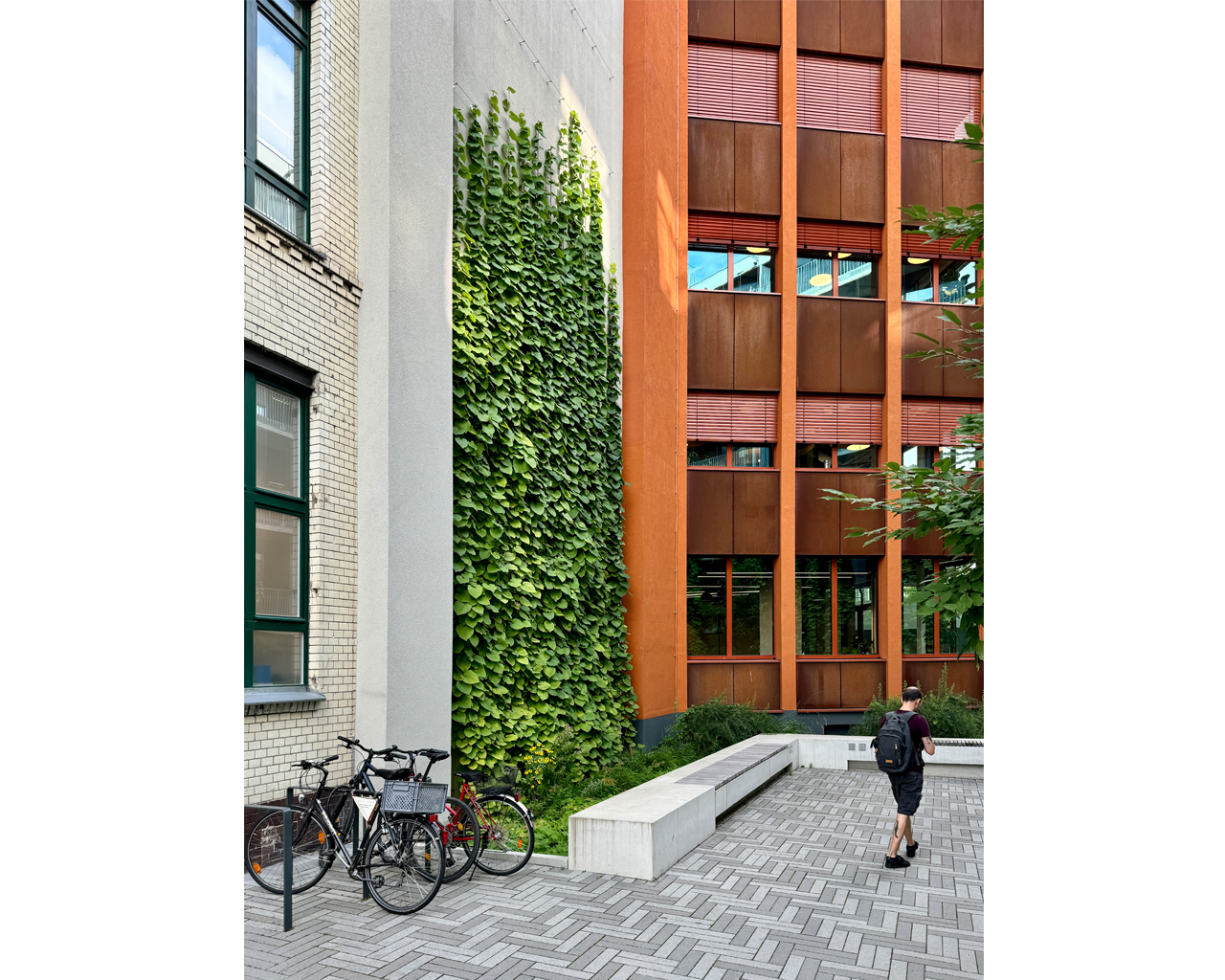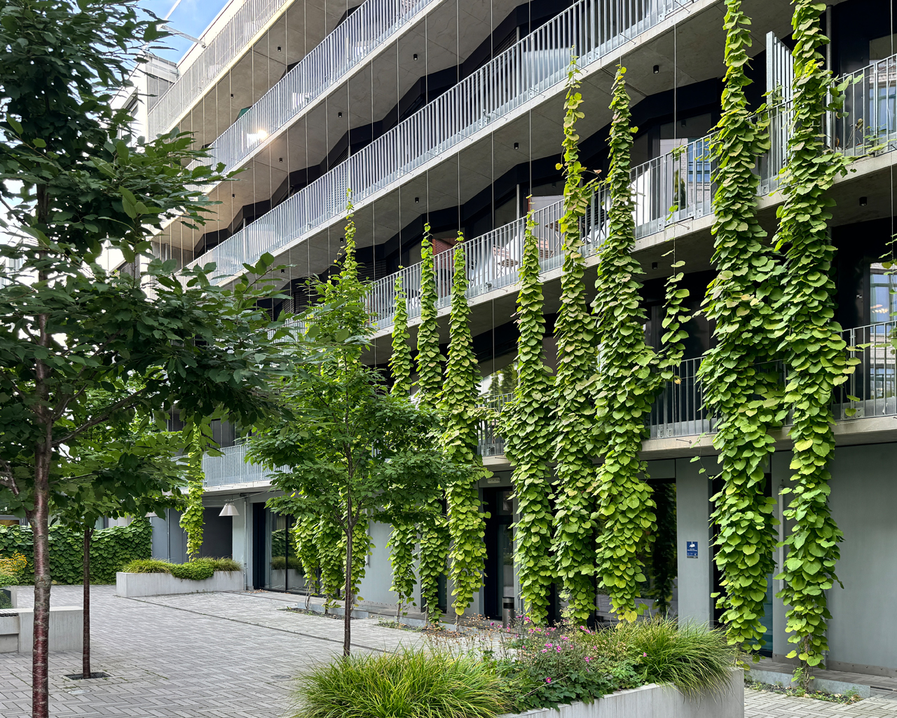 Nicht zuletzt leisten auch die verschiedentlich wiederkehrenden Gestaltungselemente in den miteinander verbundenen Innenhöfen ihren Beitrag zur Verknüpfung der Epochen. Mittels umfangreicher Begrünung der Höfe, Dachterrassen und Balkonbereiche sowie einer hochwertigen Möblierung ist zudem die Aufenthaltsqualität der Außenbereiche der Qualität der inneren Räumlichkeiten angeglichen.