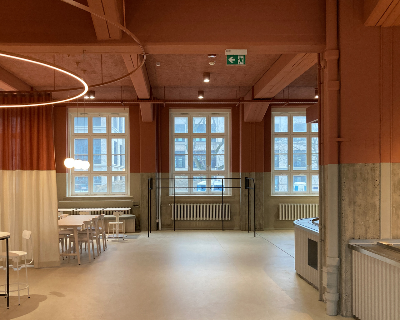 Die Gestaltung des alten wie nun auch des neuen Gastraums hat die Idee seiner einstigen Nutzung als Gewerbefläche aufgenommen und unterstreicht durch das Freilegen der Tragstruktur sowie durch schlichte und klare Oberflächen seinen industriellen Charakter.
