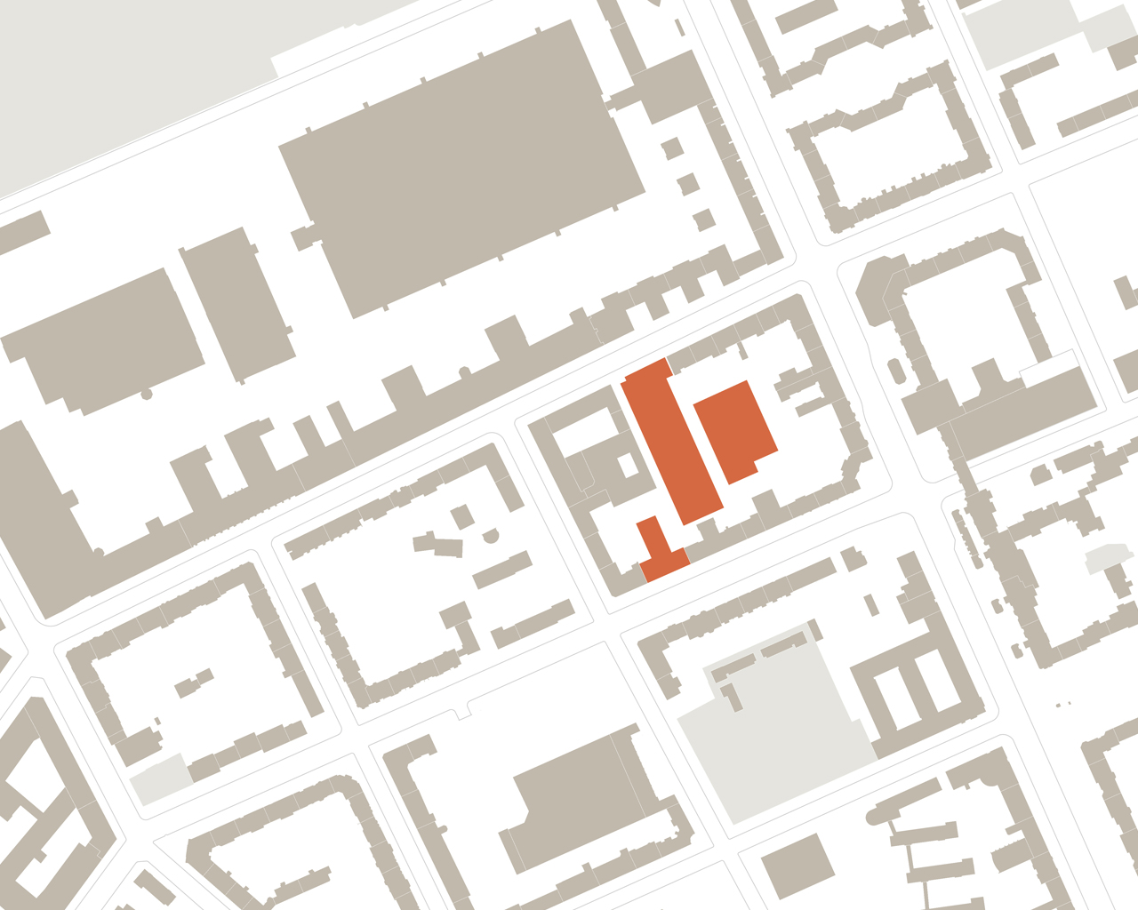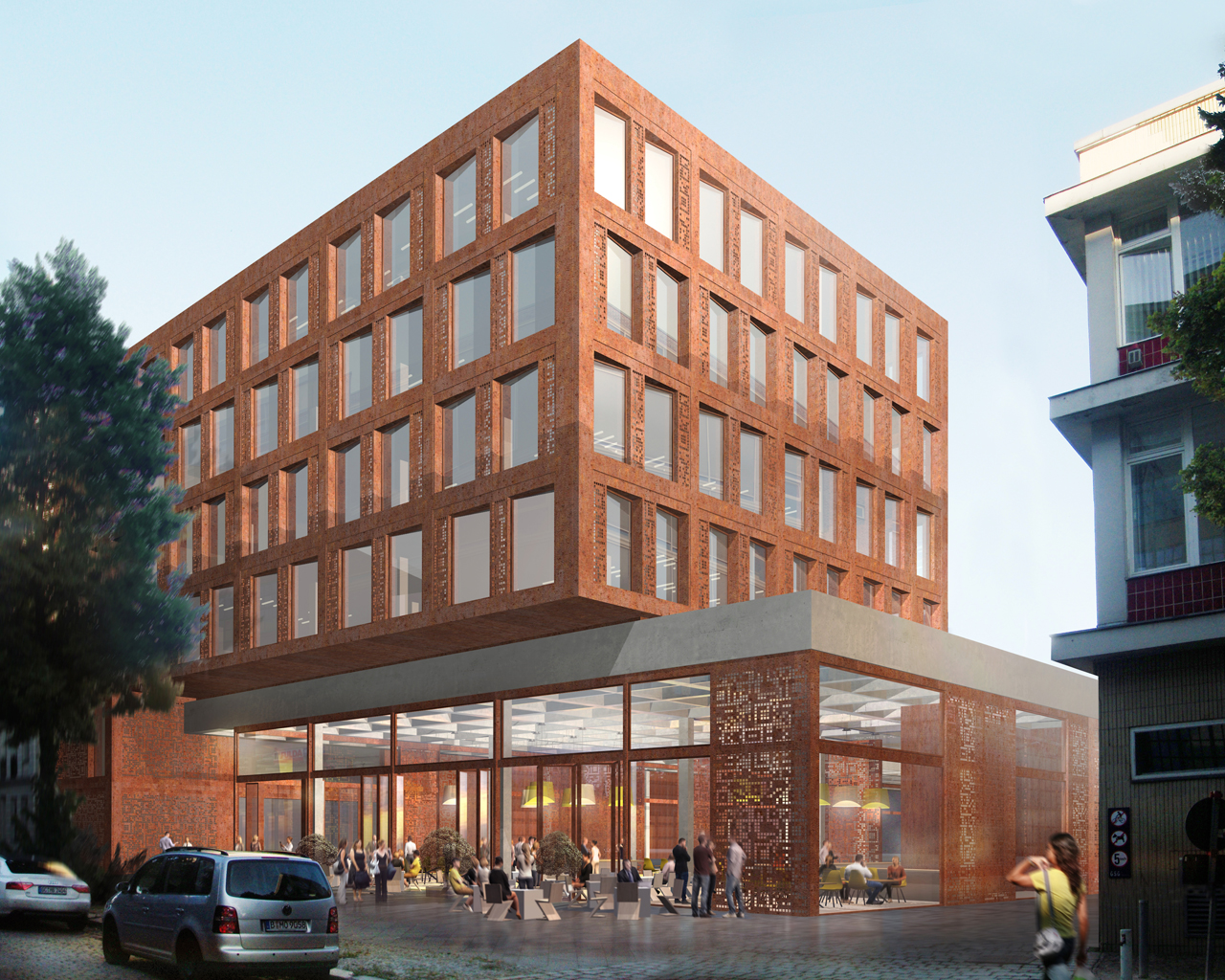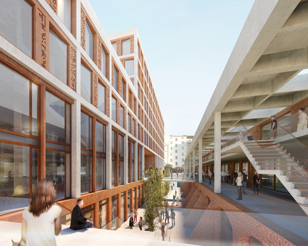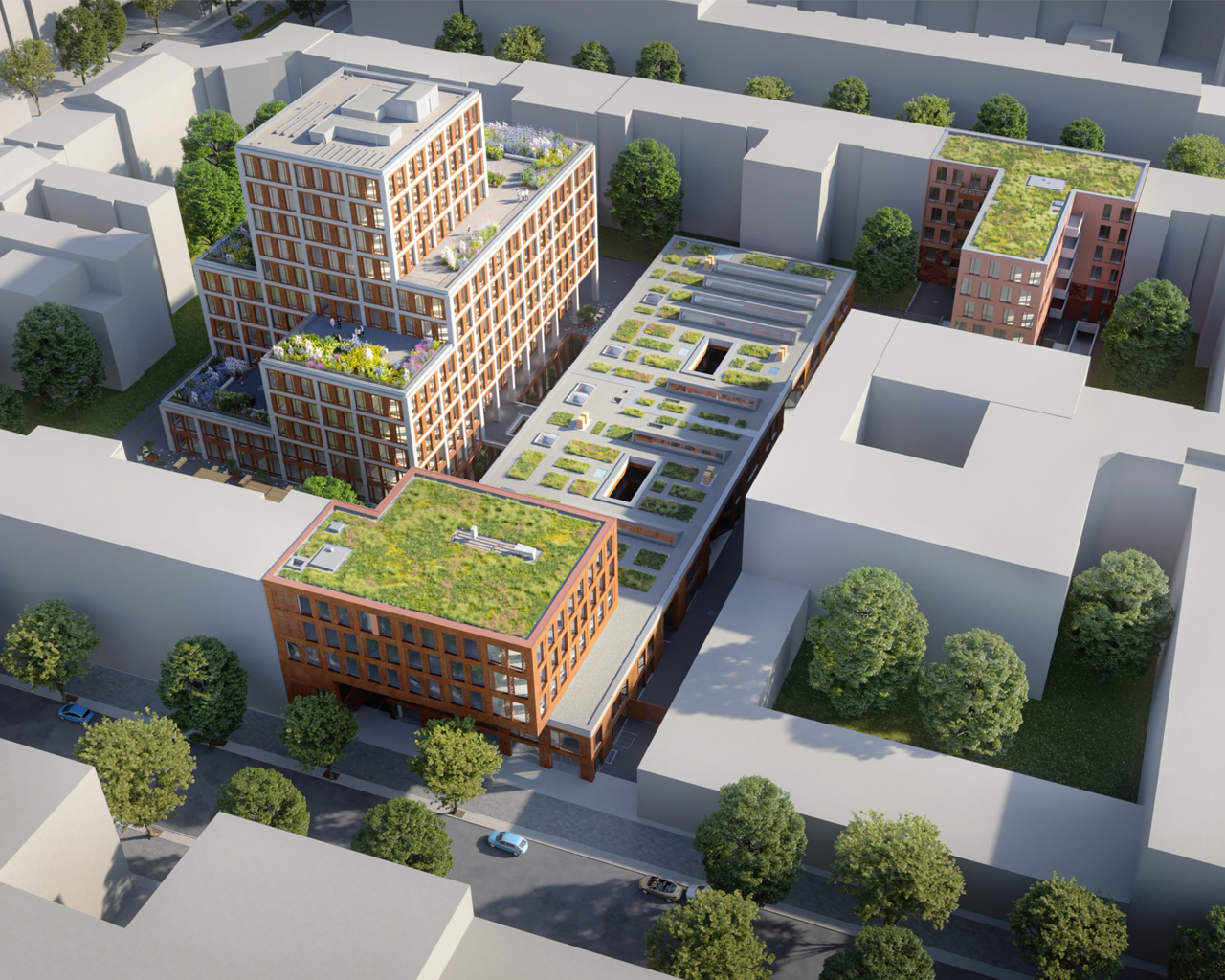 Wir verstehen das Gelände als Verbindungselement von Alt und Neu und haben seinen ältesten historischen Kern, die alte Schlachthofhalle, in seiner Idee wieder aufgenommen und baulich bis an die heutige Außengrenze zur Voltastraße verlängert. Die auf dem Raster seiner historischen Kellerpfeiler errichtete Halle wie auch alle anderen eingestellten Gebäude spielen vom Grundriss bis zur Fassade mit dieser ursprünglichen Rasterung. In Interpretation der einstigen Industriebauten sind die Gebäude in Holzhybridbauweise mit rötlichem Cortenstahl konzipiert.