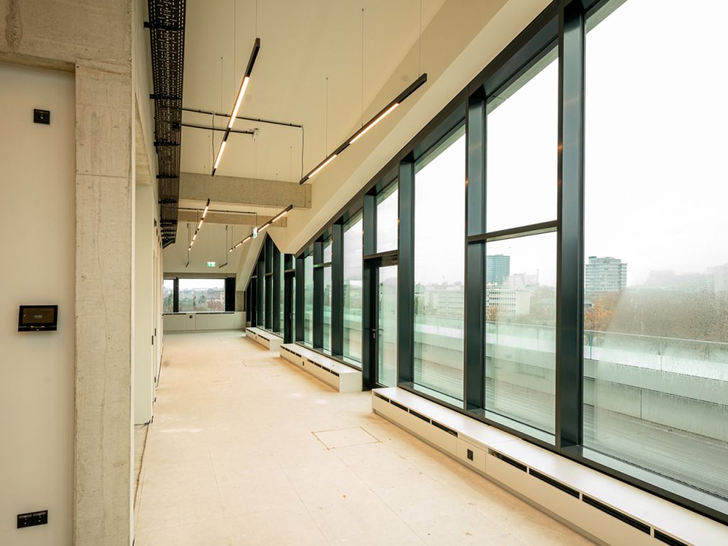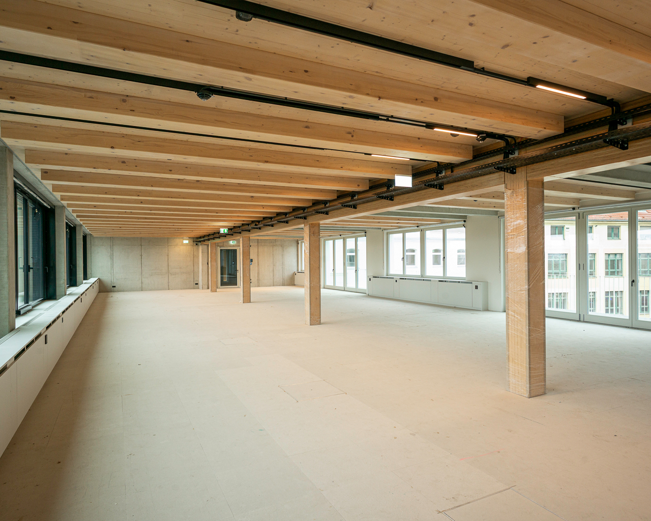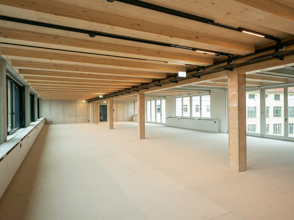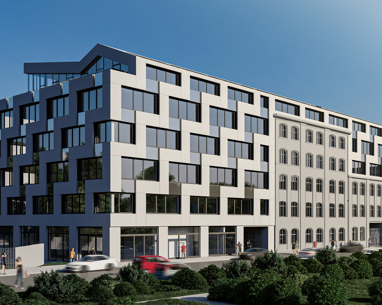 Unser Neubaukonzept nimmt die vorhandenen Gebäude-, Material- und Flächenqualitäten auf, modernisiert sie, wo nötig und setzt sie anschließend fort. Die neu entstehenden Flächen bieten offene und klare Raumstrukturen, die auf die unterschiedlichen Anforderungen und Bedürfnisse der zukünftigen Mieter flexibel reagieren können. Die klimafreundliche Ausstattung des Neubaus wird ergänzt durch seine Holzhybridbauweise sowie eine umfangreiche Begrünung der Innenhöfe.
