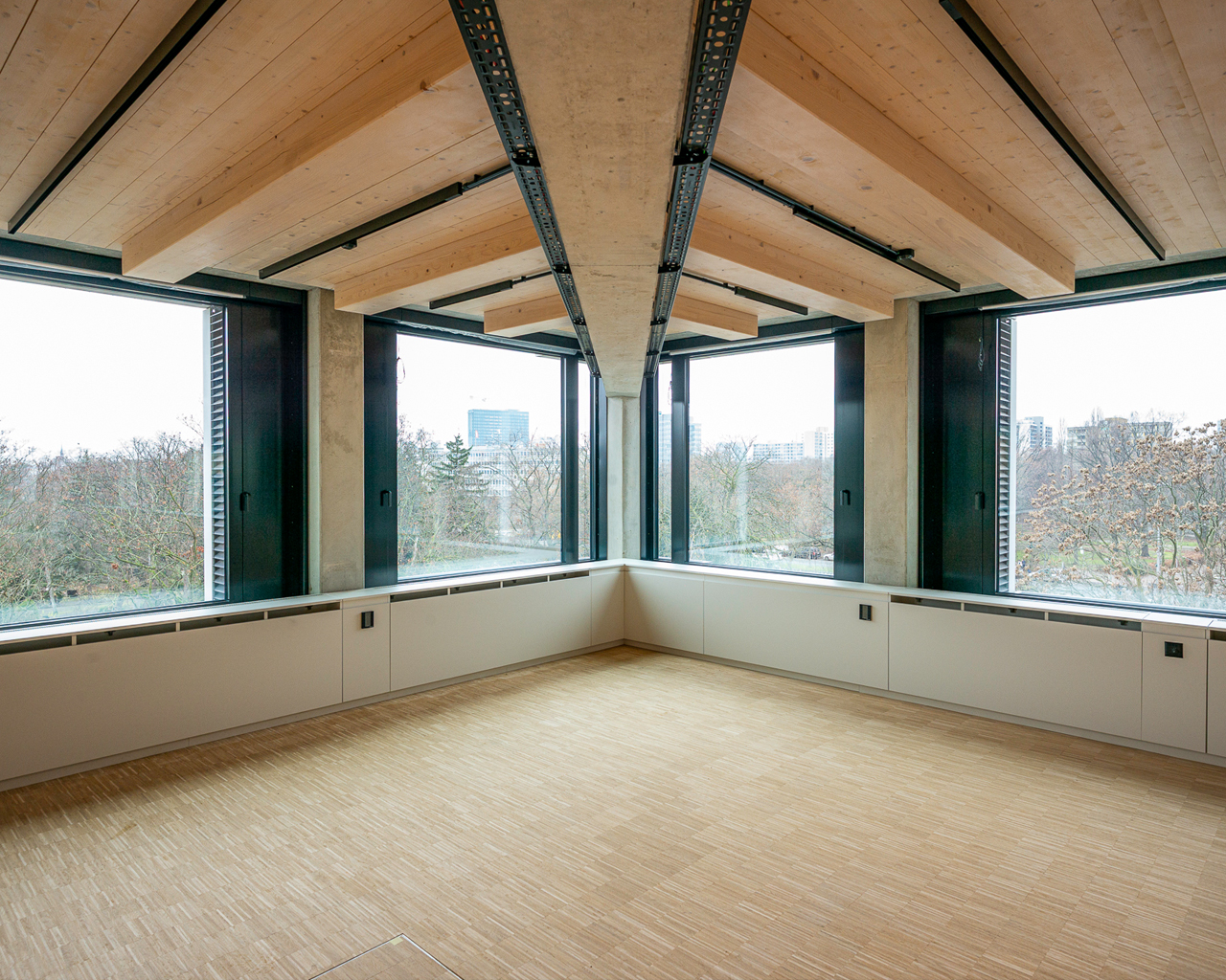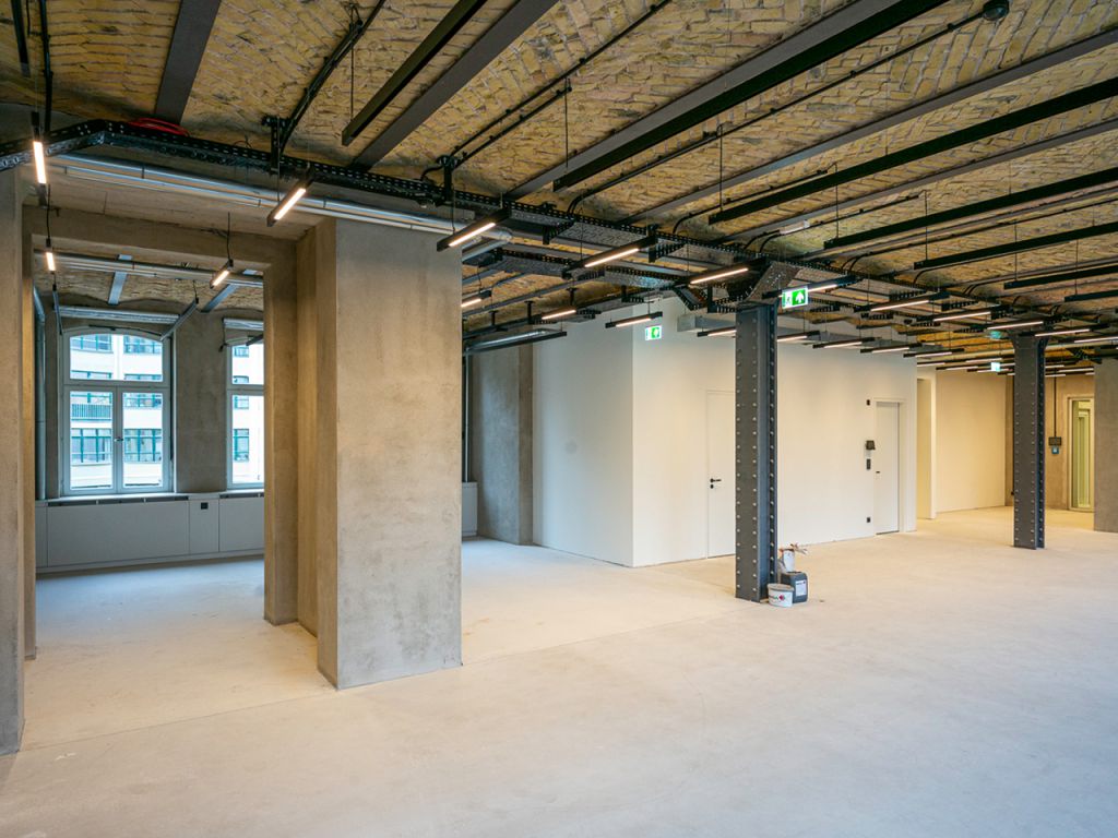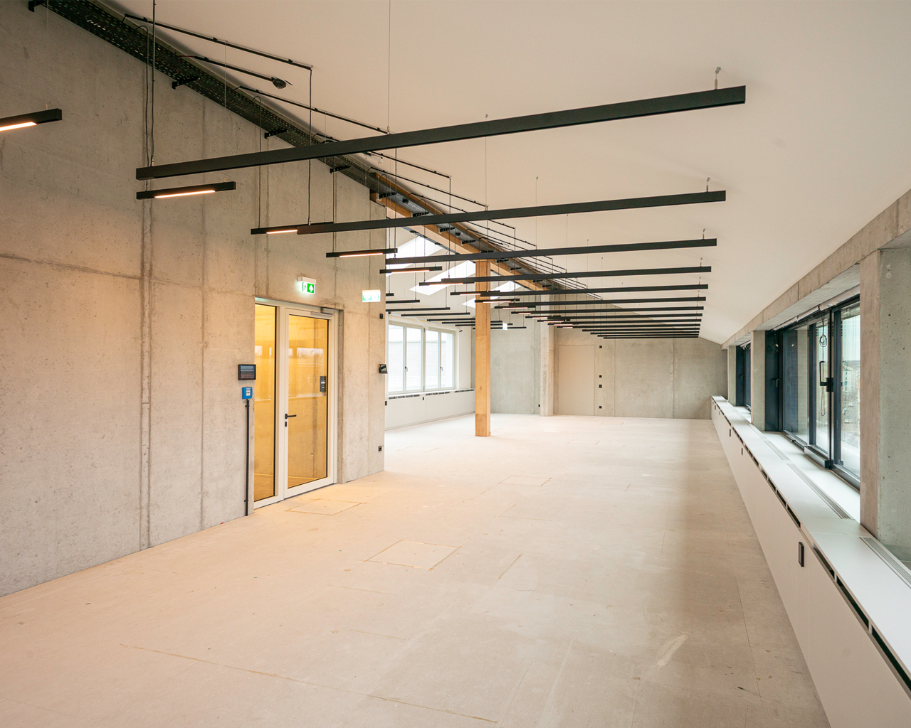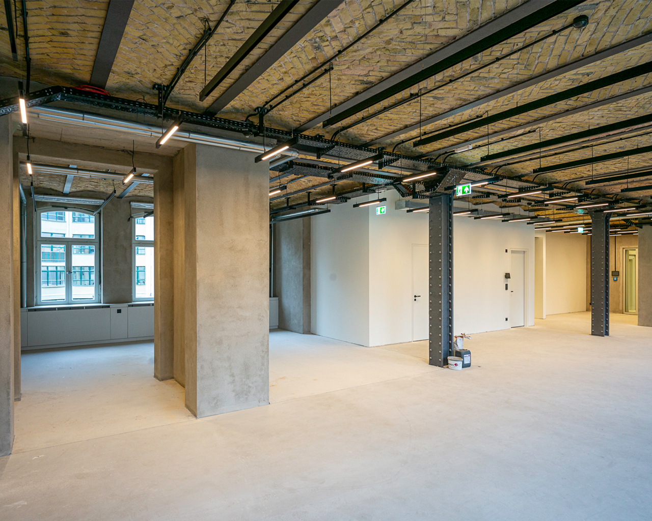 Unser Neubaukonzept nimmt die vorhandenen Gebäude-, Material- und Flächenqualitäten auf, modernisiert sie, wo nötig und setzt sie anschließend fort. Die neu entstehenden Flächen bieten offene und klare Raumstrukturen, die auf die unterschiedlichen Anforderungen und Bedürfnisse der zukünftigen Mieter flexibel reagieren können. Die klimafreundliche Ausstattung des Neubaus wird ergänzt durch seine Holzhybridbauweise sowie eine umfangreiche Begrünung der Innenhöfe.