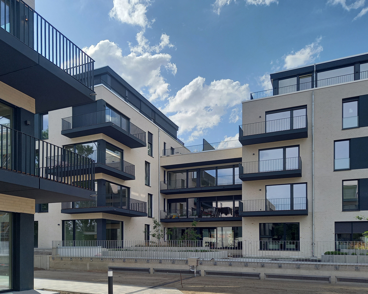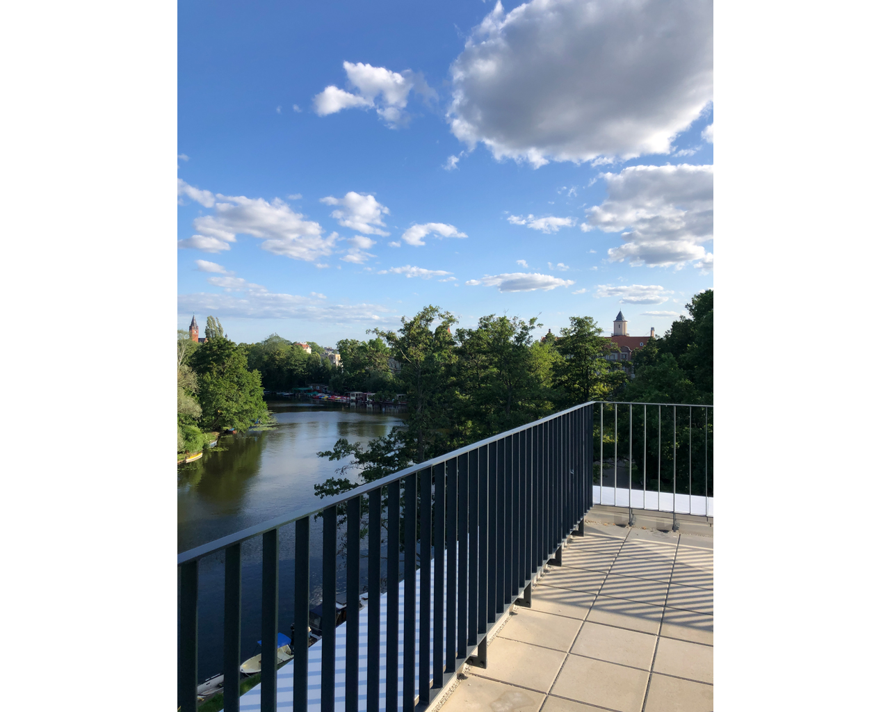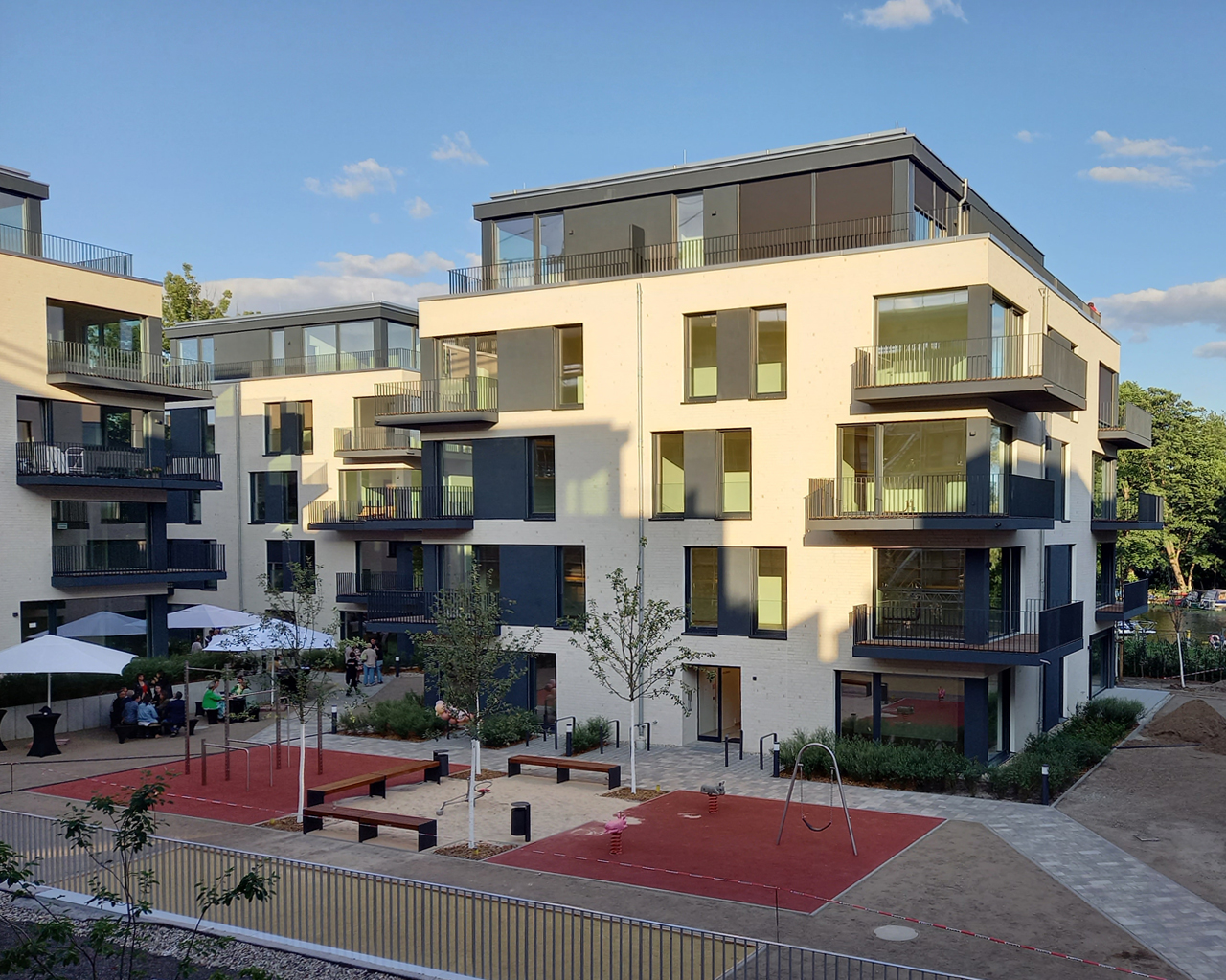 An diesem wunderbaren Ort übernahmen wir die Ausführungsplanung für vier wasserseitig gelegene Wohnhäuser mit vier bzw. fünf Geschossen sowie für einen ebenfalls fünfgeschossigen, straßenseitig entstehenden Gebäuderiegel mit dreißigprozentigem Gewerbeanteil. Es wurde Wert darauf gelegt, die Wohnungsgrößen deutlich zu variieren und sowohl für Einzelpersonen als auch Familien zu konzipieren. Ergänzend ist ein Drittel der Wohnungen barrierefrei. Alle Wohnungen verfügen darüber hinaus über großzügige Balkone bzw. Gartenanteile oder Dachterrassen. Es könnte kaum schöner sein.