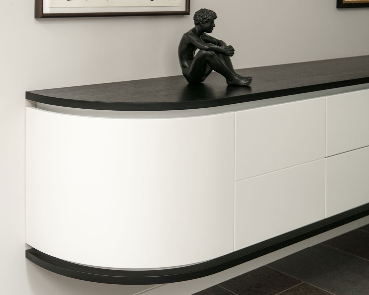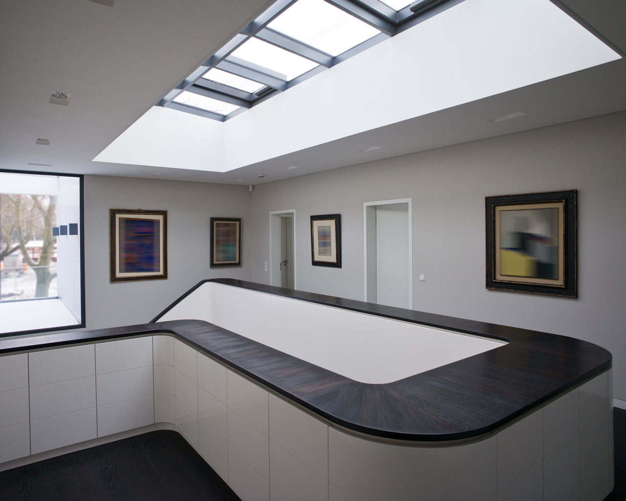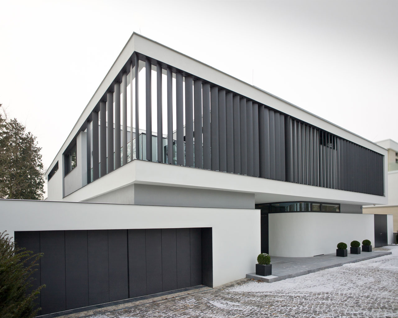 Die Gesamtform dieses Gebäudes nimmt einerseits ureigene Merkmale des Typus Villa, wie die zentrale Halle auf, andererseits lehnt es sich z.B. durch seine Horizontale an die Formensprache der klassischen Moderne an. Zur Straße gliedert sich das Gebäude in einen fensterlosen Sockel und – getrennt durch eine zurückgesetzte Fuge – ein Obergeschoss mit vertikalen Lamellen. Durch geschwungene Wände wird der Zugang ins Gebäudeinnere inszeniert. Dieser Schwung setzt sich innen fort, wo eine als ‚Möbel’ ausgebildete Freitreppe und Galerie die beiden Geschosse miteinander verbindet. Die rückwärtigen Räume, auch das Schwimmbad im Untergeschoss, öffnen sich über großzügige Fensterflächen und ausladende Terrassen zum neu gestalteten Garten.