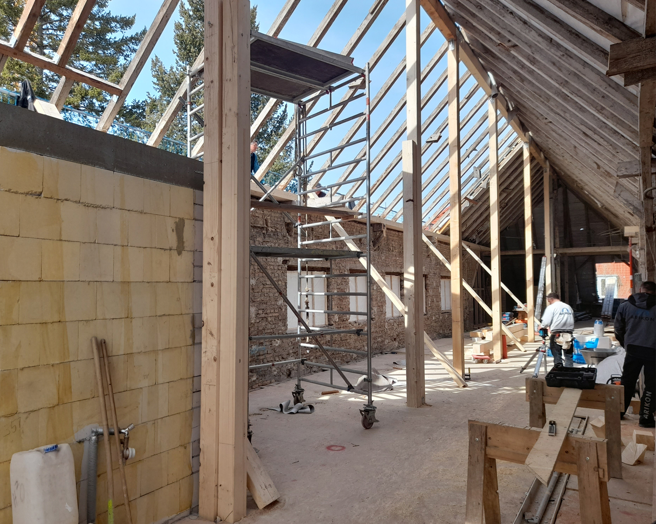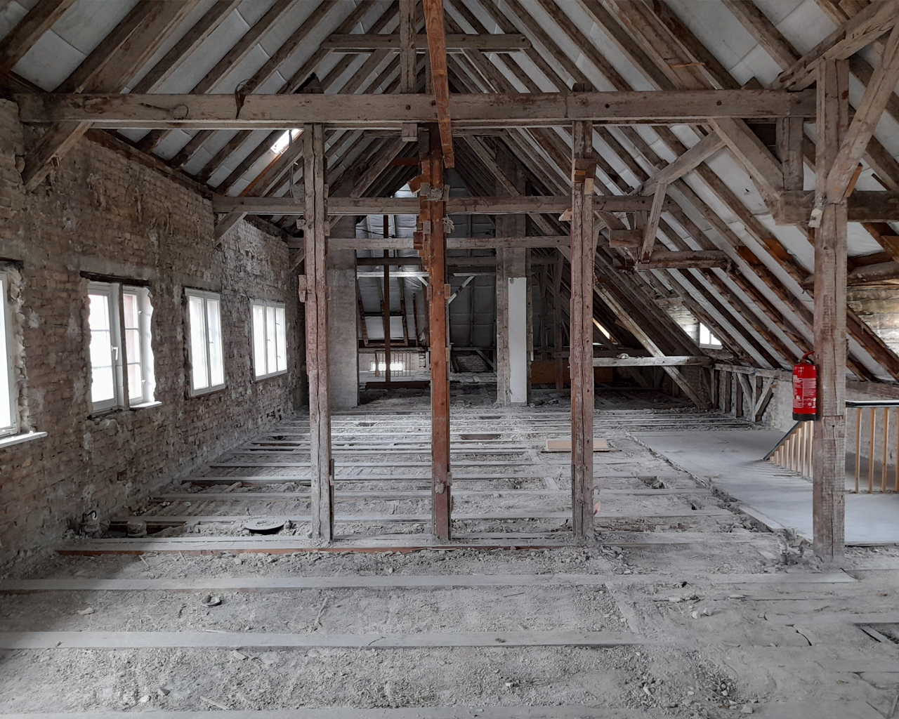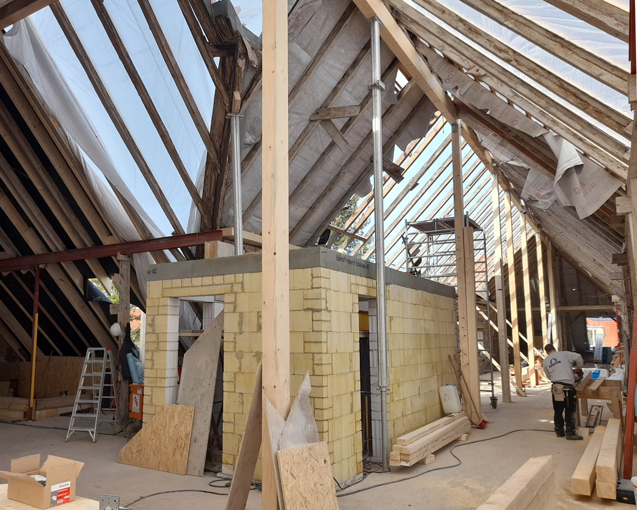 Mittlerweile konzentrieren sich die Bauarbeiten auf das in einem bemerkenswert spitzen Winkel in die Höhe ragende Dach und dessen Ausbau zu großzügigen Wohnungen. Die spezielle historische Ausgangslage wurde in 32 großzügige und individuelle Wohnungen übertragen, die mit ungewöhnlichen und daher um so reizvolleren Details aufwarten. Der umfangreiche Einsatz von Gauben sowie einem „Fensterband“ und etlichen Oberlichtern lässt viel Licht in die aufragende Deckenkonstruktion.