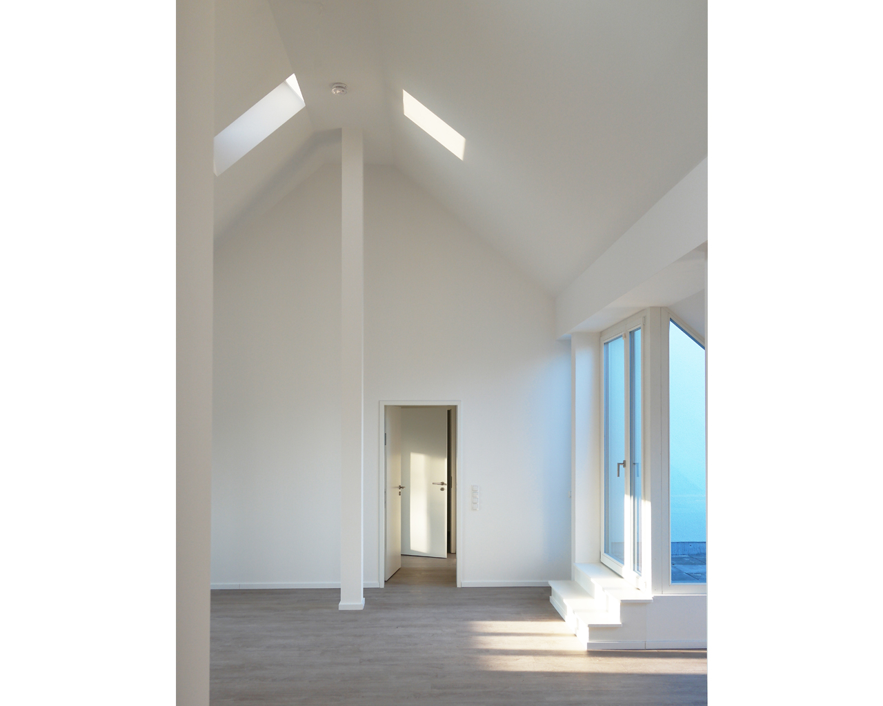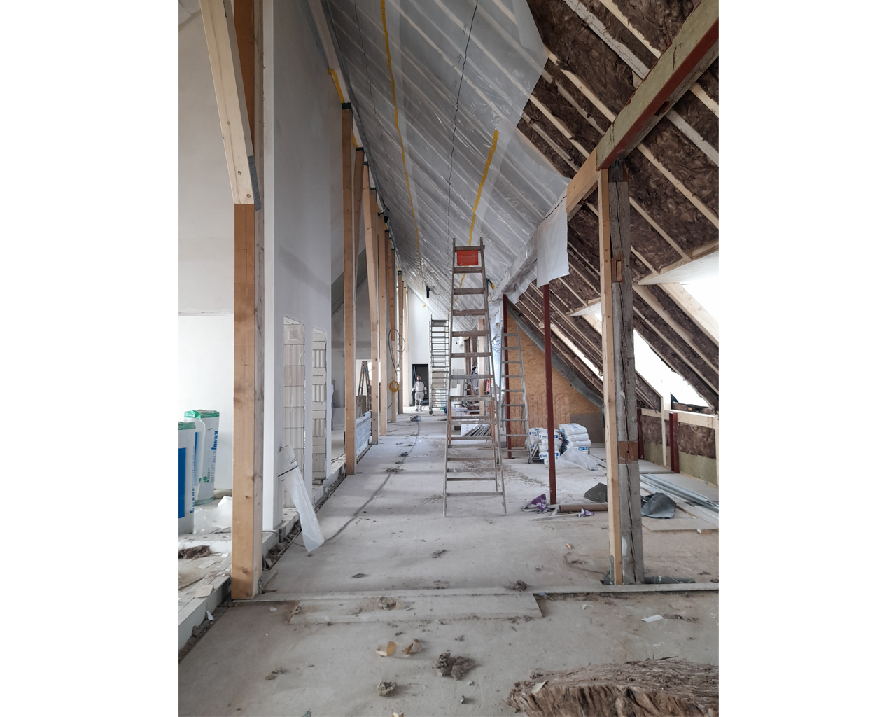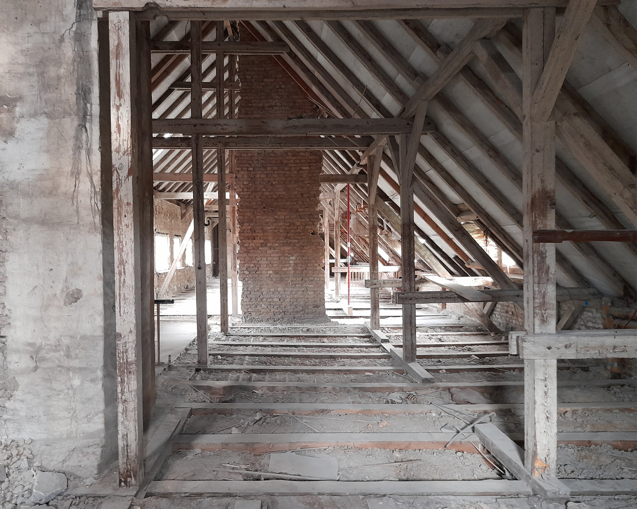 Mittlerweile konzentrieren sich die Bauarbeiten auf das in einem bemerkenswert spitzen Winkel in die Höhe ragende Dach und dessen Ausbau zu großzügigen Wohnungen. Die spezielle historische Ausgangslage wurde in 32 großzügige und individuelle Wohnungen übertragen, die mit ungewöhnlichen und daher um so reizvolleren Details aufwarten. Der umfangreiche Einsatz von Gauben sowie einem „Fensterband“ und etlichen Oberlichtern lässt viel Licht in die aufragende Deckenkonstruktion.