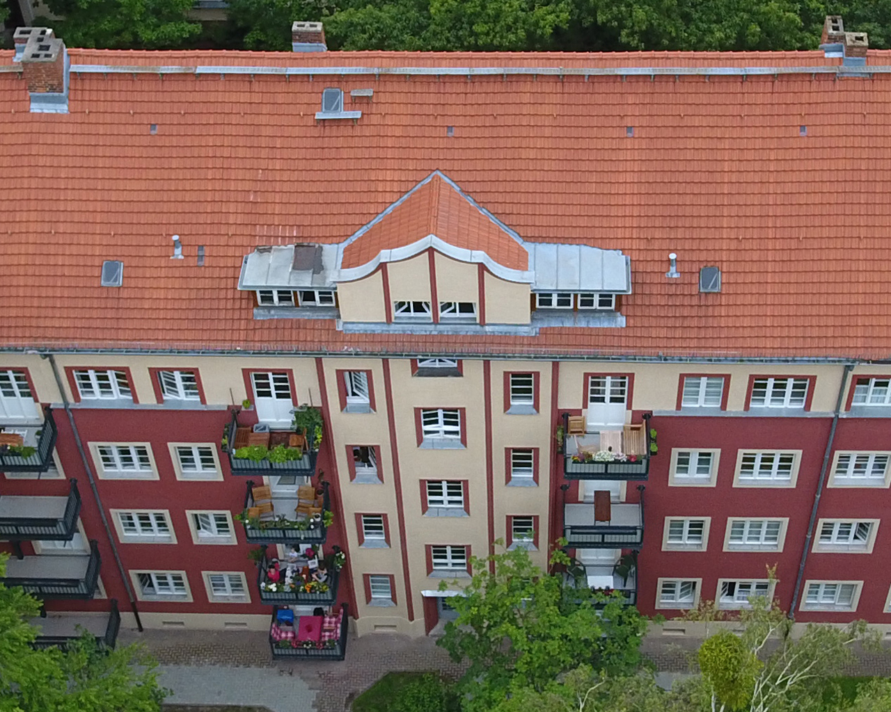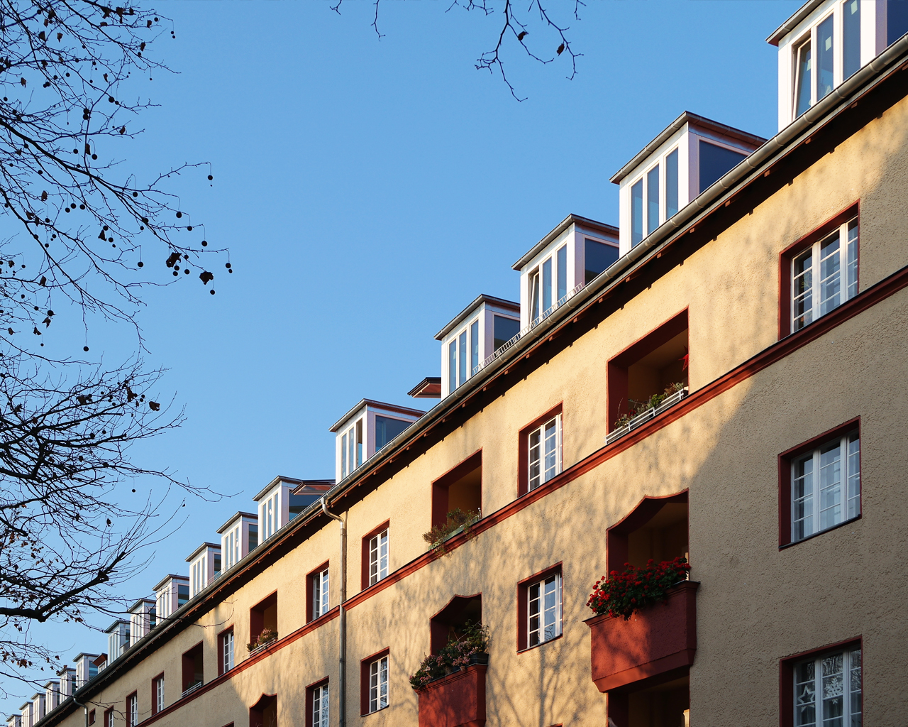 Vor einigen Jahren bereits waren wir mit der Fassadensanierung des umfangreichen Komplexes sowie der Planung hofseitiger Balkone beauftragt. Behutsam wurde damals die Balkonanlage in hängender Konstruktion ganz ohne Stützen ausgeführt und erfolgte mit ebenso viel Bedacht die Farbwahl in Anlehnung an das bereits bestehende Farbkonzept.