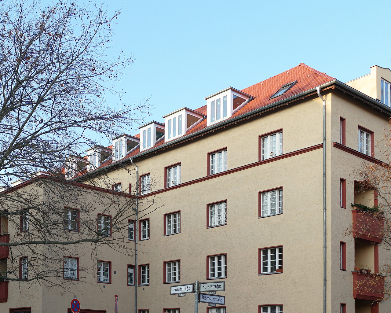 Von der quirligen Schloßstraße und den dort angesiedelten großen und kleinen Geschäften kommend, ist es verwunderlich, wie ruhig es in manchen nur wenige hundert Meter entfernten Straßenzügen zugehen kann. Hier, mitten im einstigen „Dichterviertel“ liegt die zwischen 1924 und 1828 erbaute und heute unter Denkmalschutz stehende Wohnanlage des Berliner Architekten Bruno Ahrends.