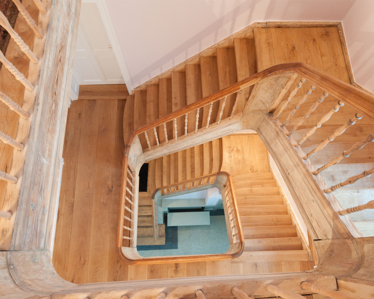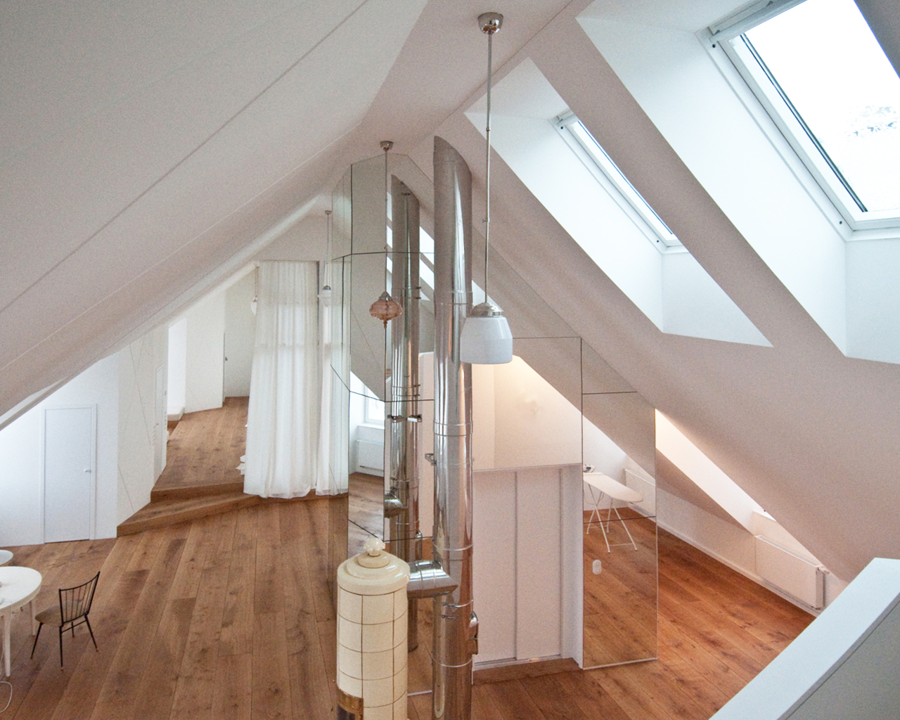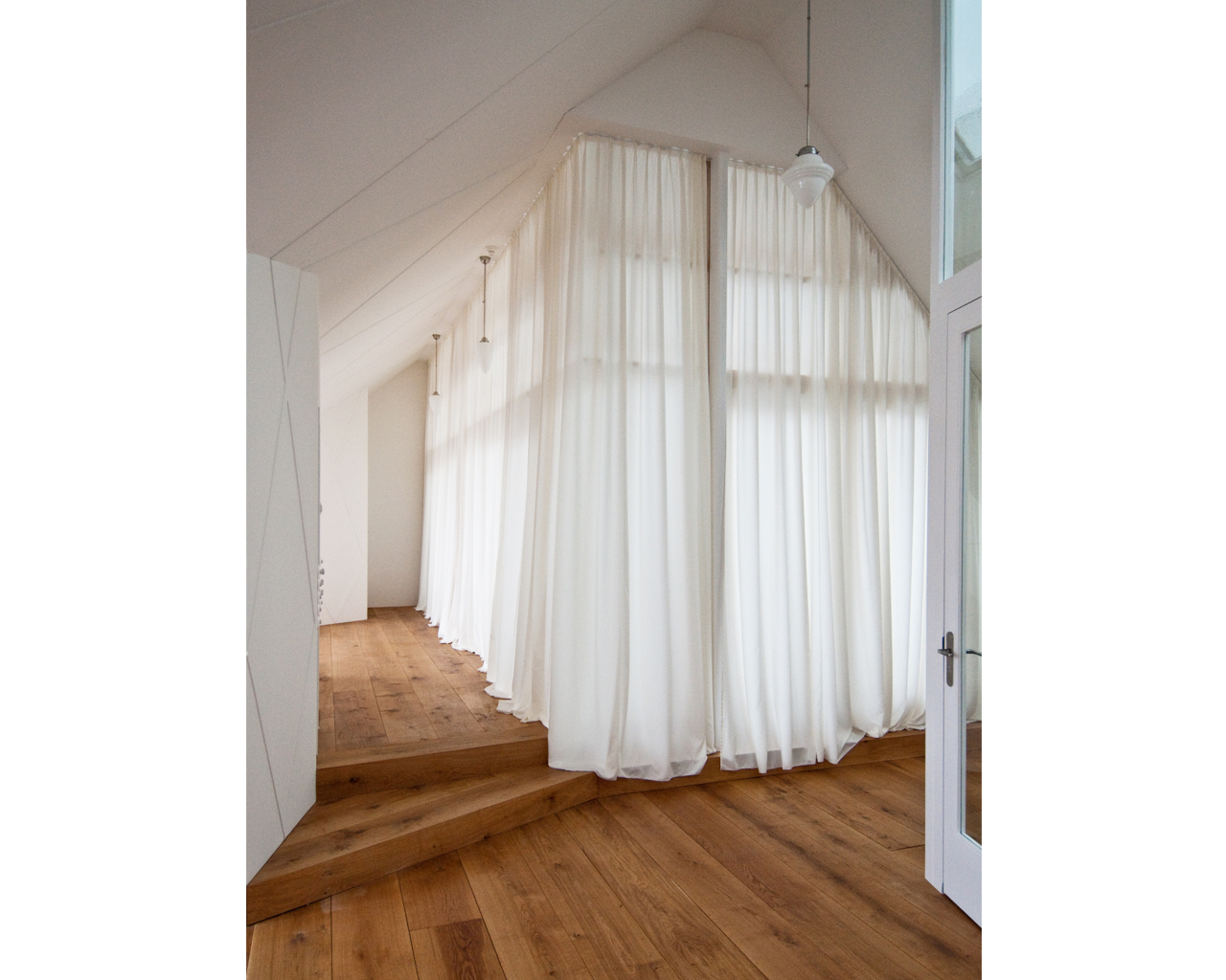 Für das im Haus untergebrachte Künstleratelier wurde die Geschossdecke zum Keller entfernt, um so eine Raumhöhe von über fünf Metern zu erreichen. die Idee der großzügigen Räume setzt sich im gesamten Gebäude und bis zum erneuerten und licht ausgebauten Dachstuhl fort.