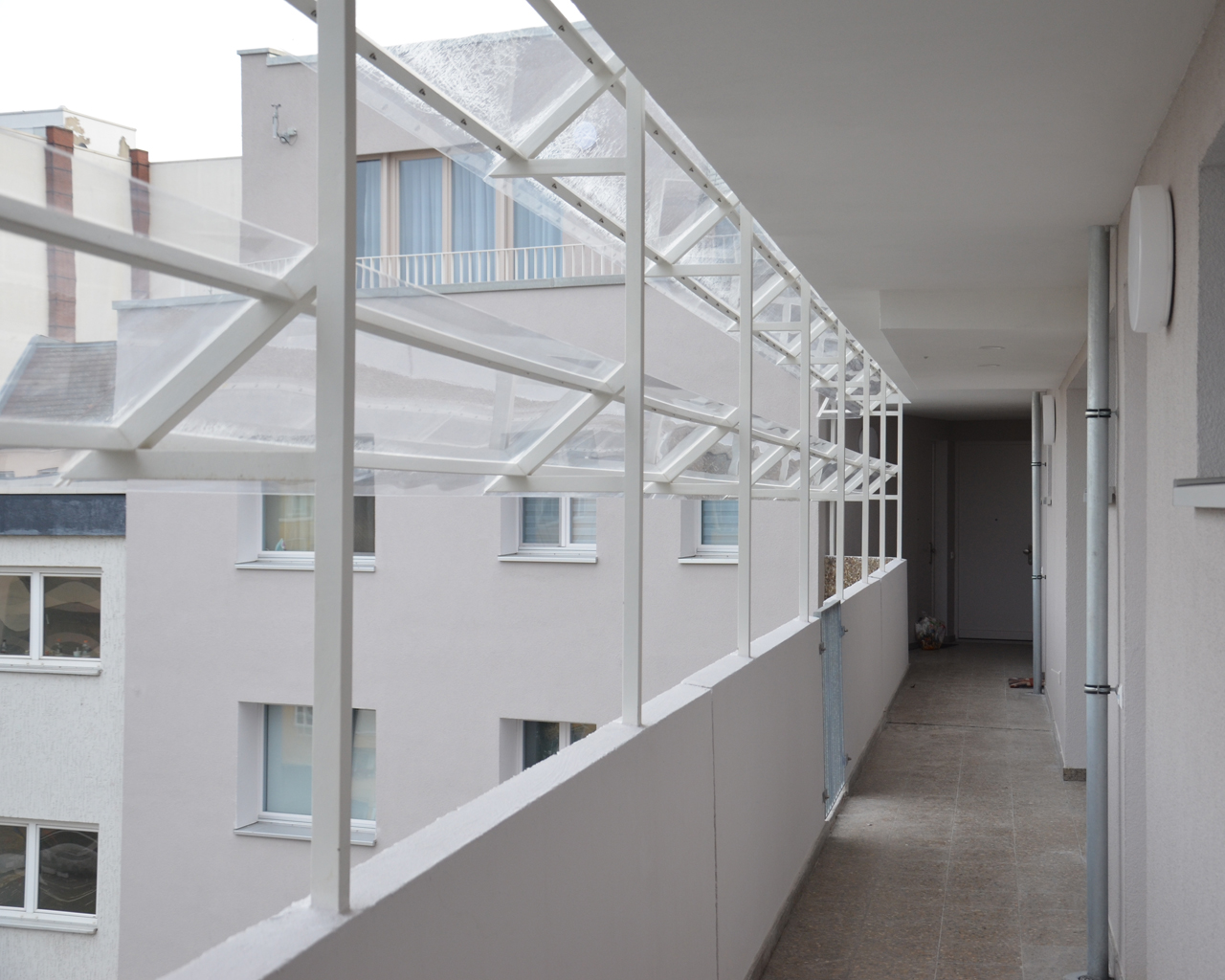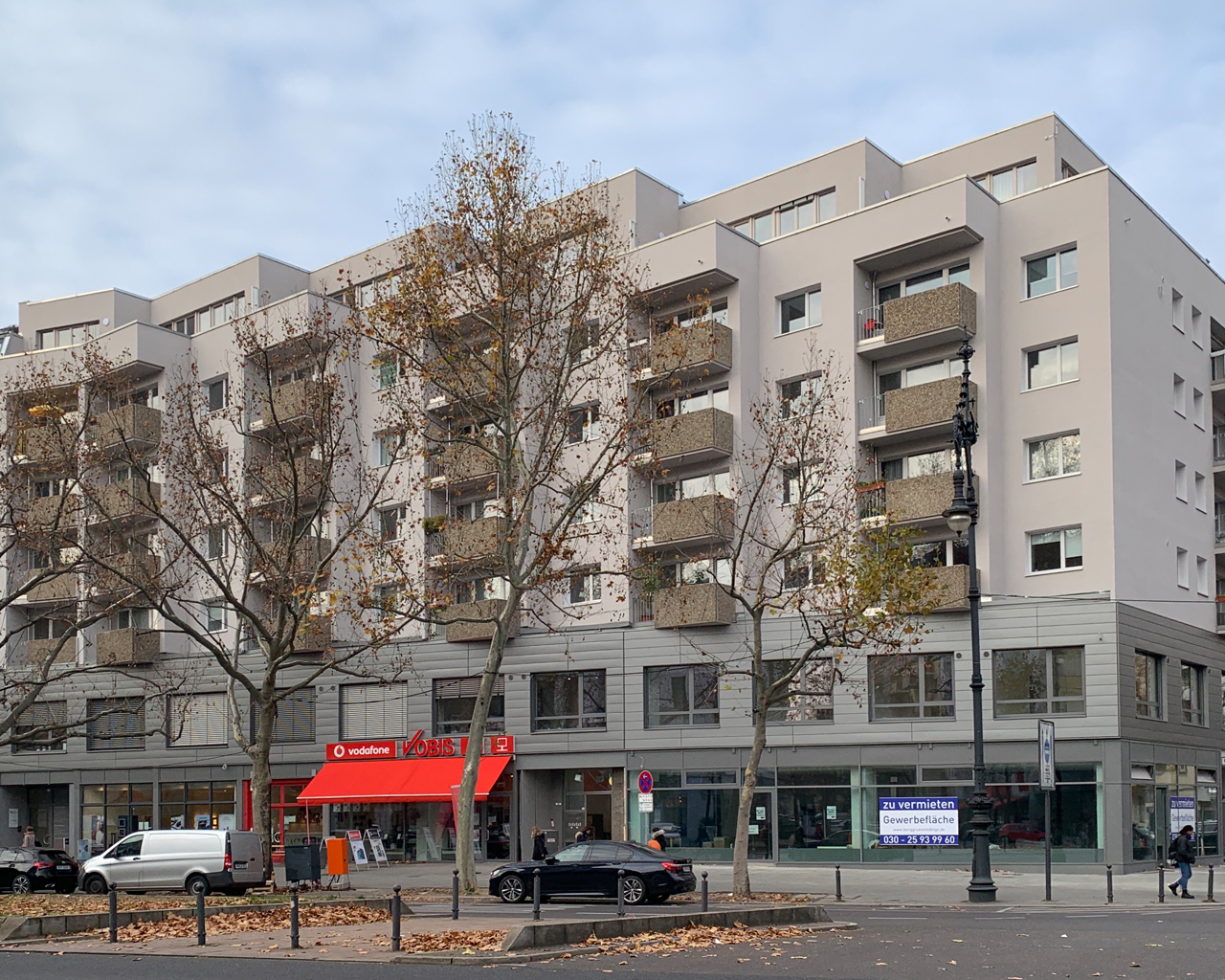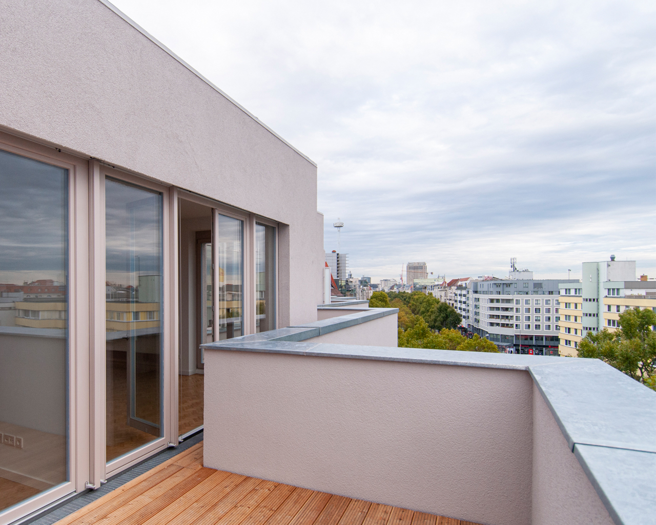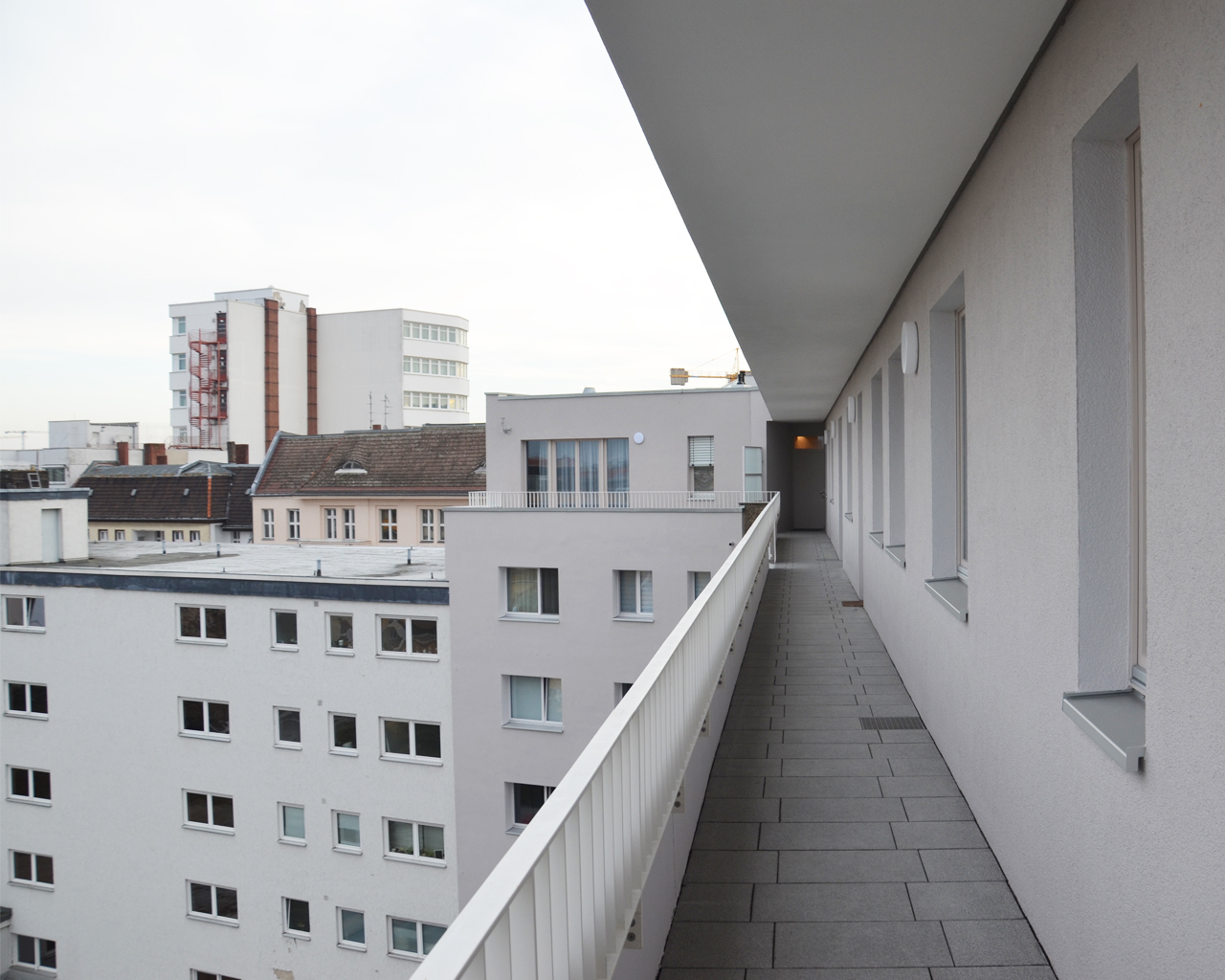 Bei unserem Objekt handelt es sich um ein 5-geschossiges Wohn- und Geschäftshaus aus dem Jahr 1971, dessen Dachgeschoss bis zum jetzigen Umbau außerdem verschiedentlich genutzte Lagerflächen beherbergte. Augenfällig am Gebäude ist die teilweise Erschließung durch hofseitige, offene Laubengänge sowie die sägezahnartig auskragende Kubatur des Hauses inklusive der Balkongestaltung ab dem zweiten Obergeschoss. Neben den „handelsüblichen“ Sanierungen und Modernisierungen des Komplexes wurde insbesondere letzteres durch die Neuplanungen gestärkt und betont herausgearbeitet. Finalisiert wurden diese Maßnahmen durch den Neuaufbau des Dachgeschosses, der nun vier neue Wohnungen samt großzügiger Dachterrassen mit bestem Blick über die Stadt beherbergt.
