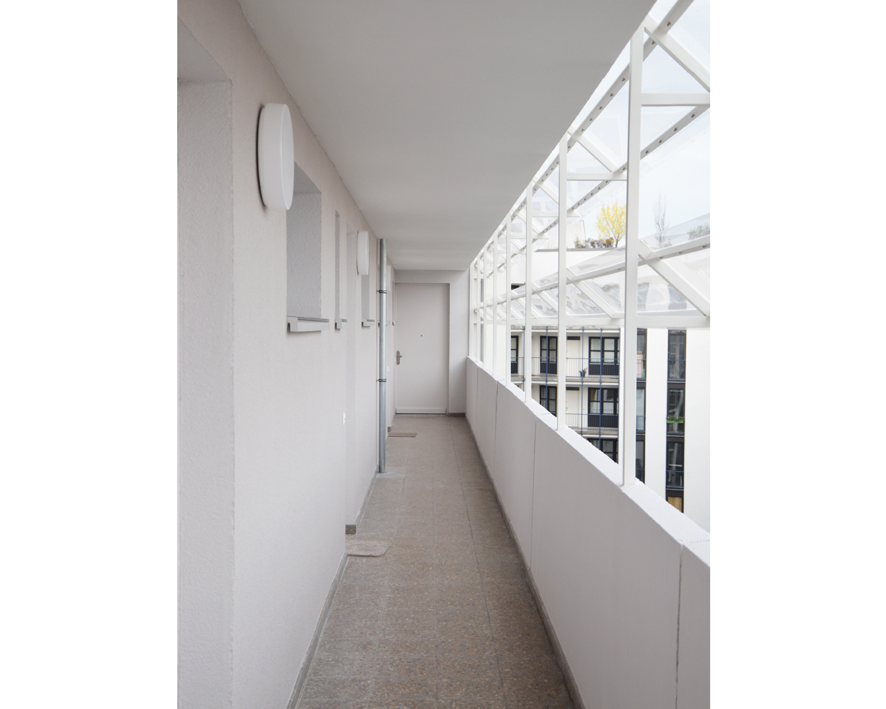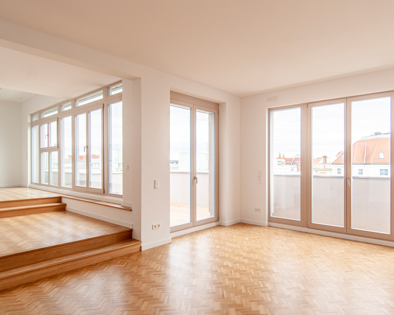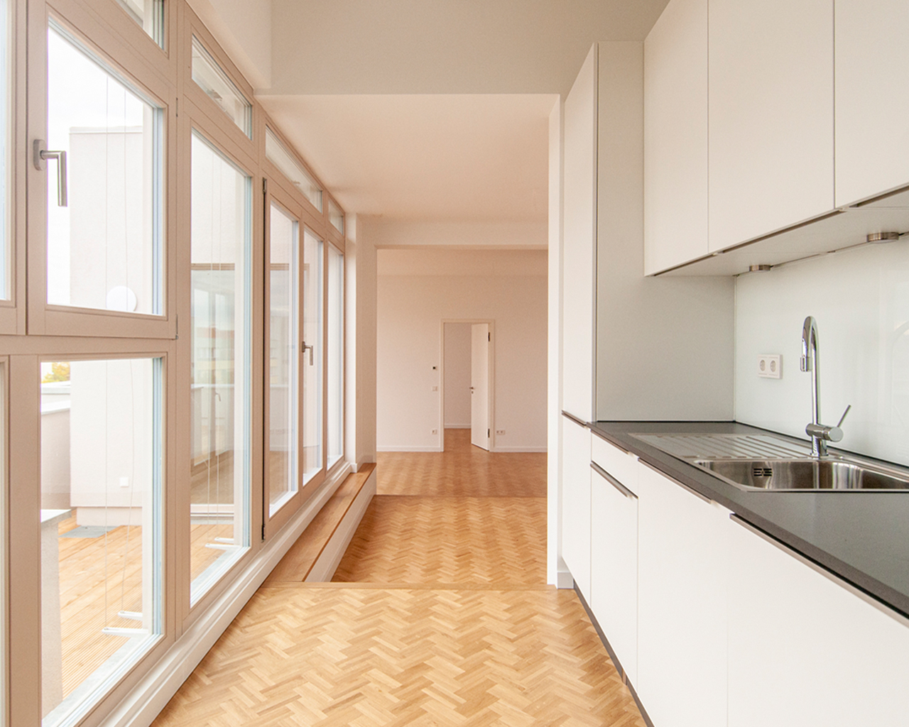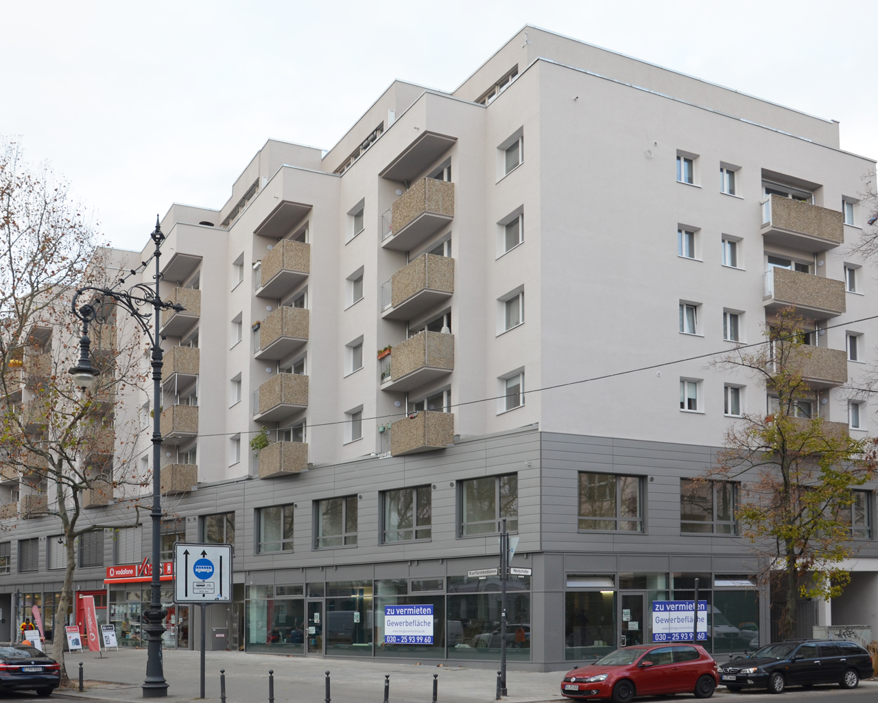 Bei unserem Objekt handelt es sich um ein 5-geschossiges Wohn- und Geschäftshaus aus dem Jahr 1971, dessen Dachgeschoss bis zum jetzigen Umbau außerdem verschiedentlich genutzte Lagerflächen beherbergte. Augenfällig am Gebäude ist die teilweise Erschließung durch hofseitige, offene Laubengänge sowie die sägezahnartig auskragende Kubatur des Hauses inklusive der Balkongestaltung ab dem zweiten Obergeschoss. Neben den „handelsüblichen“ Sanierungen und Modernisierungen des Komplexes wurde insbesondere letzteres durch die Neuplanungen gestärkt und betont herausgearbeitet. Finalisiert wurden diese Maßnahmen durch den Neuaufbau des Dachgeschosses, der nun vier neue Wohnungen samt großzügiger Dachterrassen mit bestem Blick über die Stadt beherbergt.