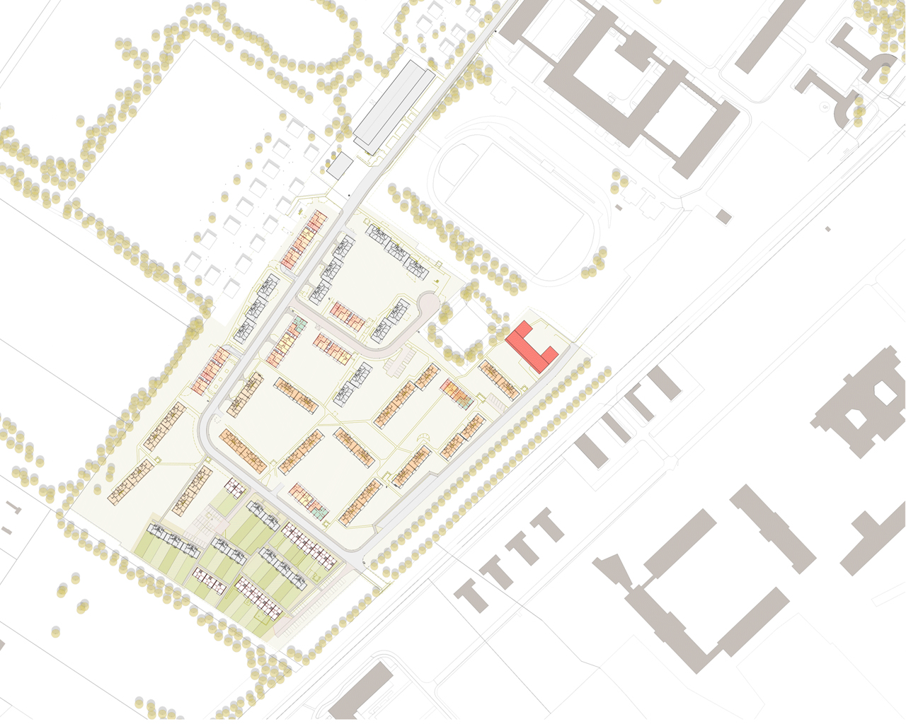 Für die ausgedehnten Freiflächen innerhalb eines früheren britischen Kasernengeländes mit Offizierswohnungen planen wir Wohngebäude, die sich einerseits an ihre baulichen Nachbarn aus den 1960er Jahren anpassen, gleichzeitig aber z. B. vertikal neu strukturiert sind: dreigeschossig, ohne Keller, dafür mit Dachgeschoss. Bei der Zusammenstellung von Wohnungstypen planen wir durch eine effiziente, modulare Bauweise eine größtmögliche Flexibilität und ein vielfältiges Angebot an Wohnungsgrößen und -typologien.