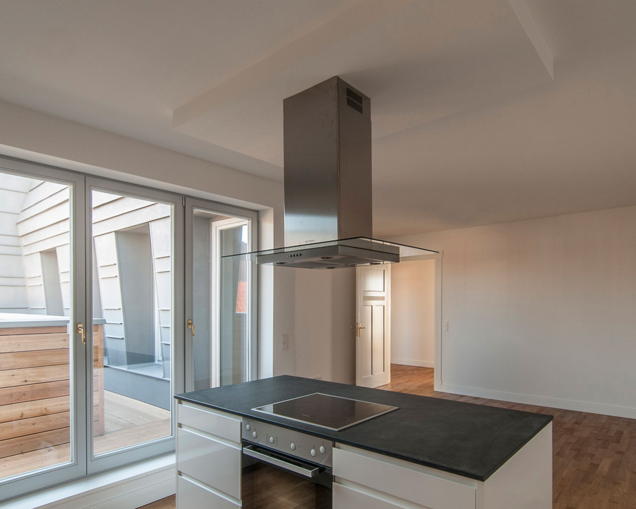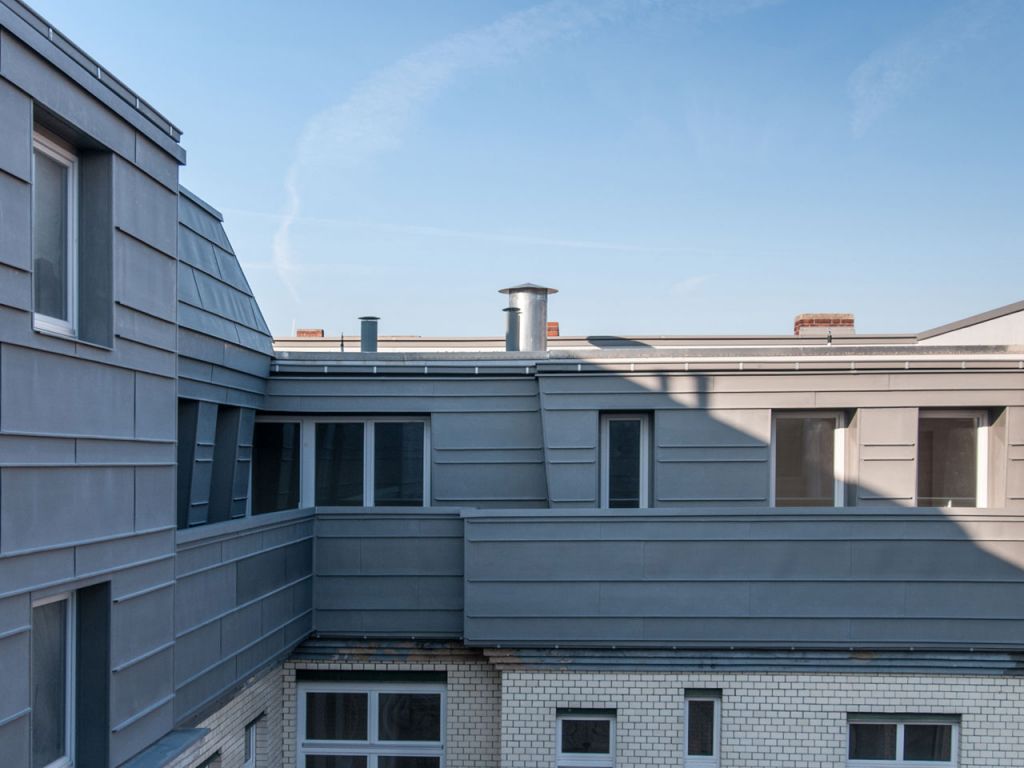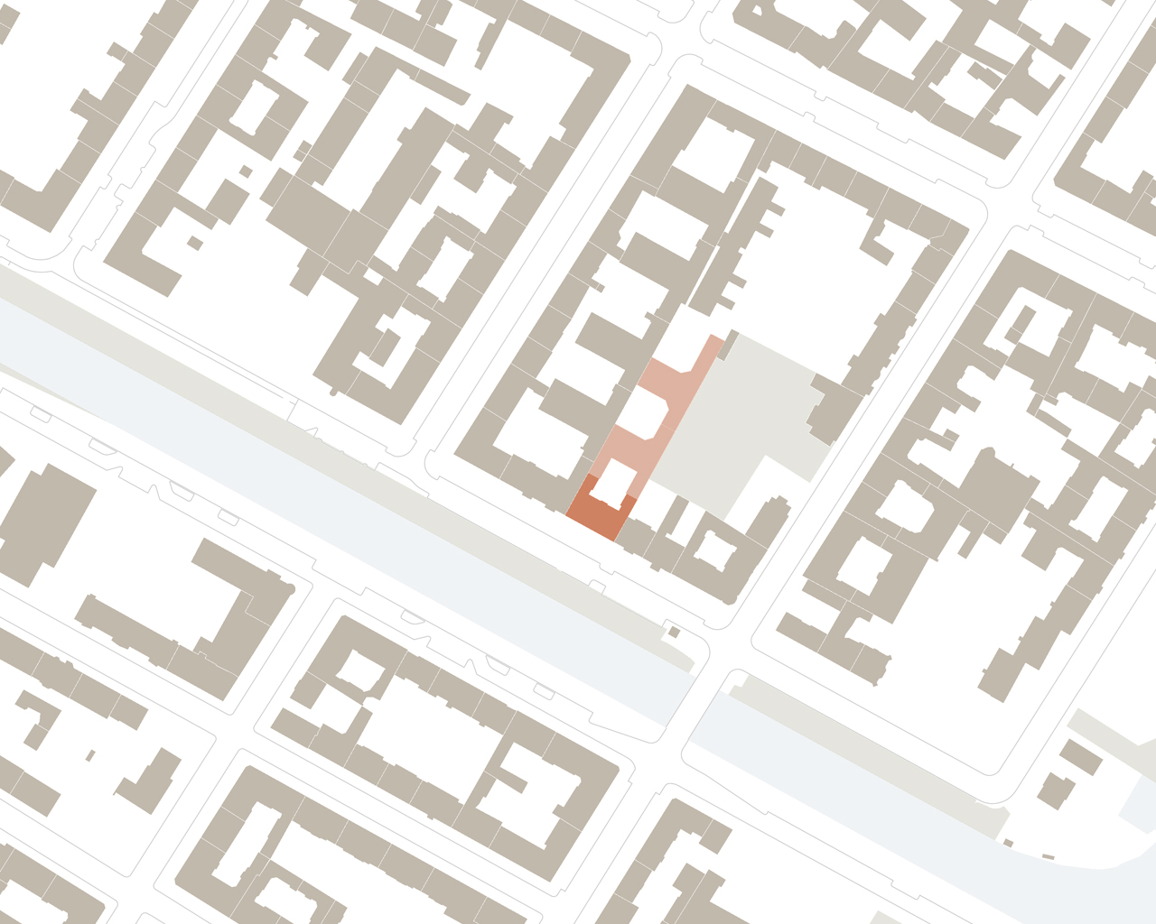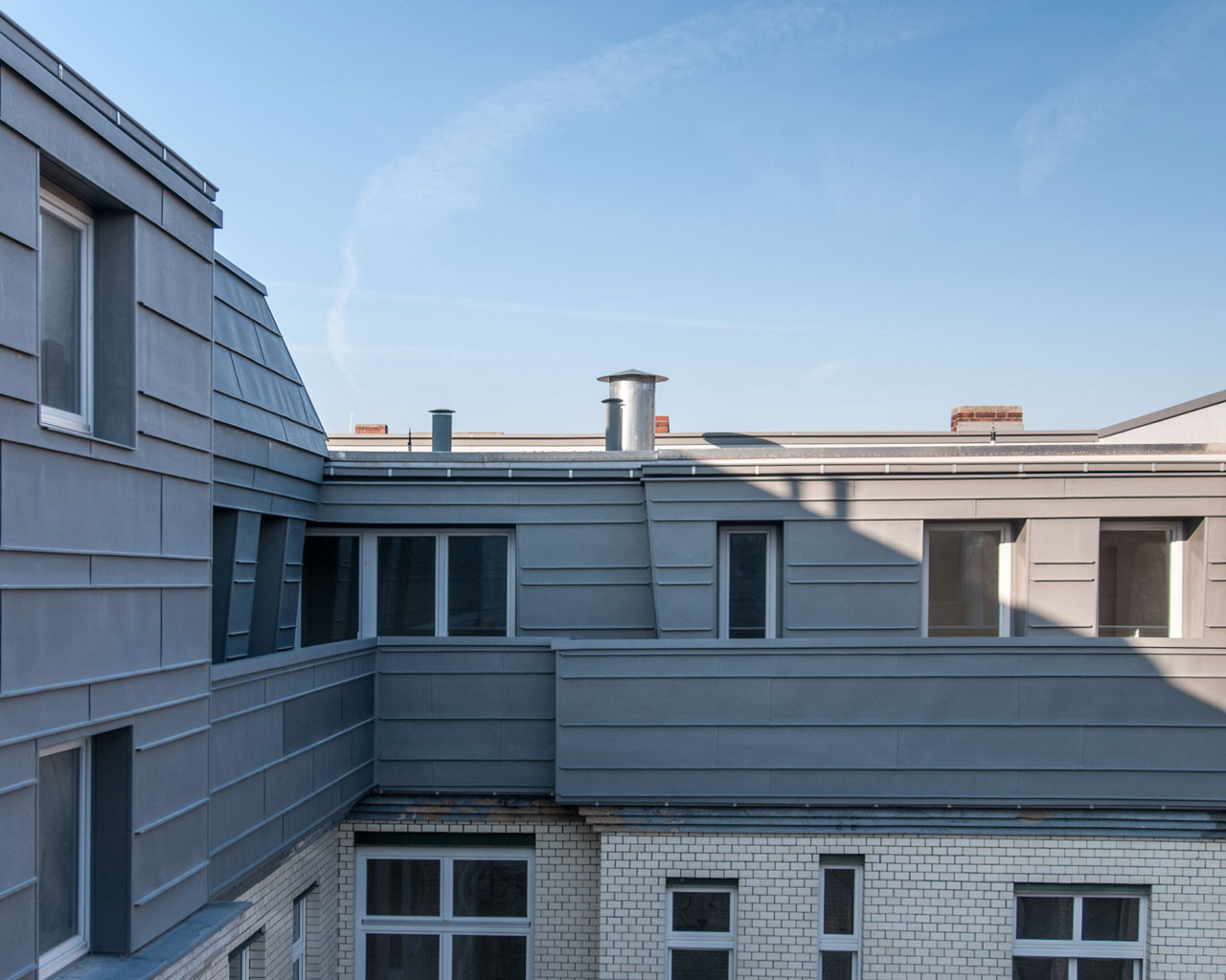 Für die Bebauung einer typisch tiefen Kreuzberger Parzelle mit Vorderhaus, Seitenflügeln und Quergebäuden wurde nach einem Brand im Vorderhaus zunächst dieses neu geplant.