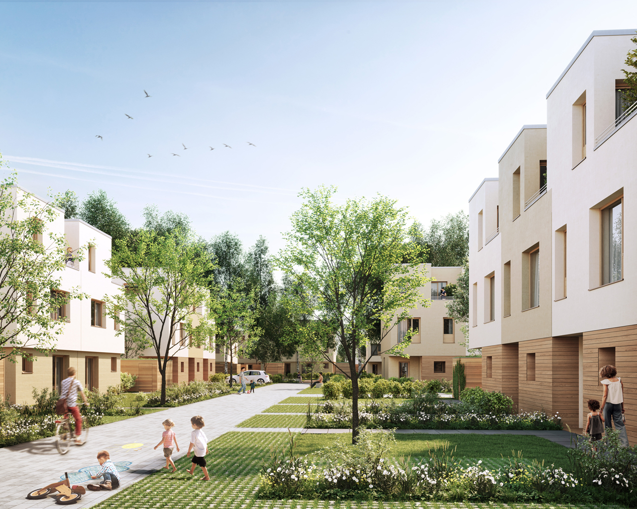 Im Ortsteil Blankenburg integrieren wir - eingebettet in eine bestehende Wohnsiedlung - ein neues Wohnquartier für alle, die an nachbarschaftlichen Bezügen und nachhaltigen Gemeinschaften interessiert sind, die die Anbindung ans urbane Gefüge der Großstadt aber auch nicht missen möchten. Dem gemeinschaftlichen Gedanken gemäß unterstand das Projekt von Beginn an einer großen Öffentlichkeitsbeteiligung. Eine offene Durchwegung, ein zentral gelegenes Gemeinschaftshaus sowie verschiedene aus dem Bestand erhaltene Grünflächen setzen den kommunikativen Gedanken auch baulich um.